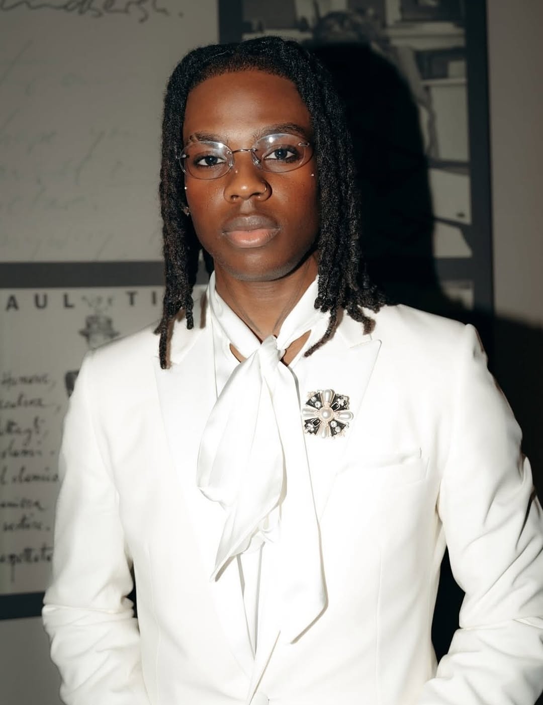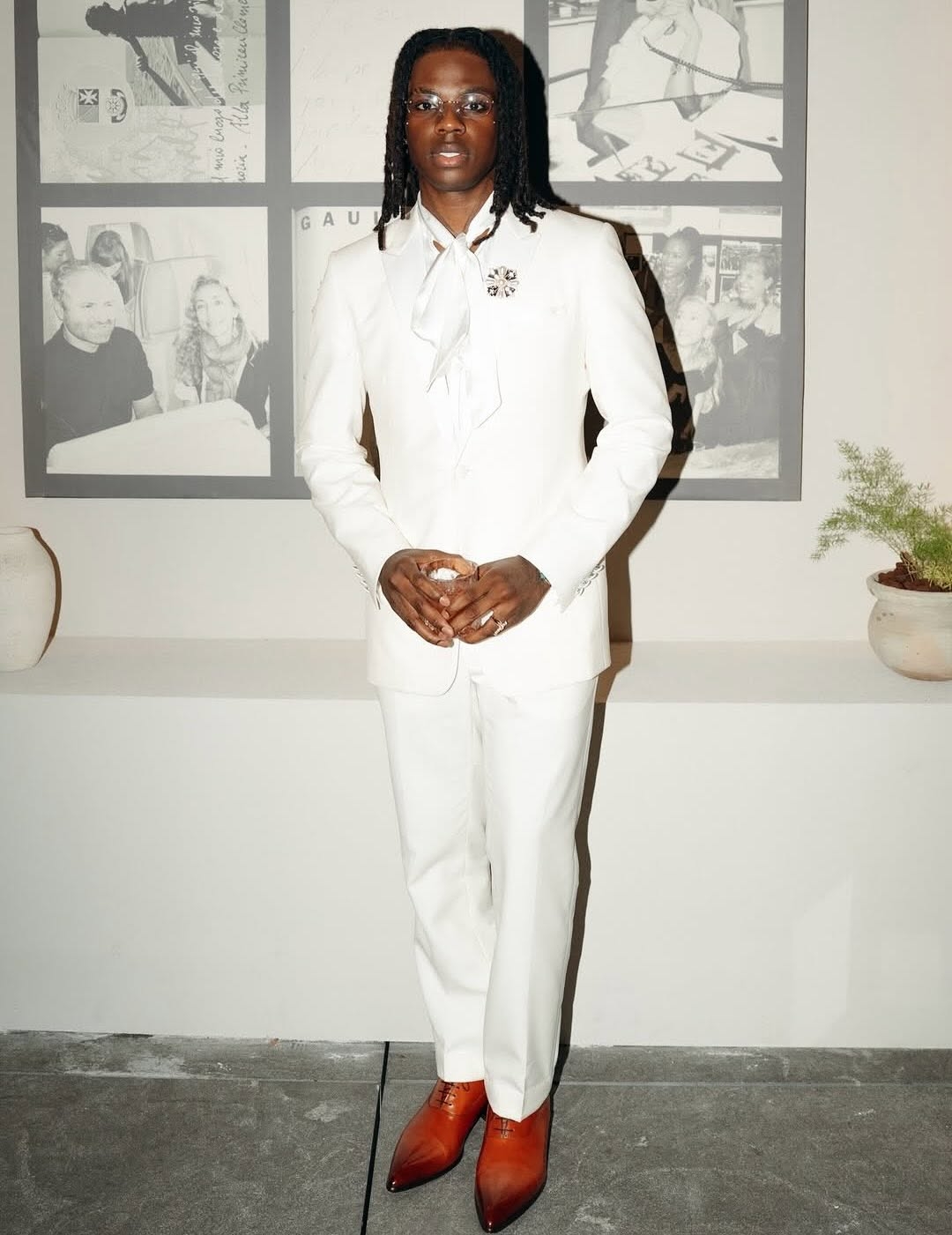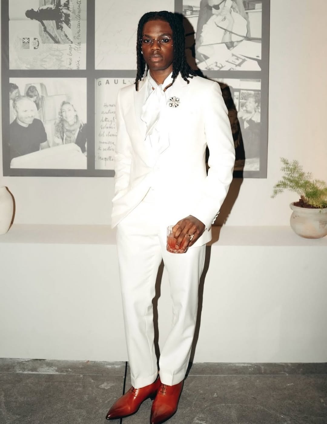 For an evening that’s set against a mix of personal interpretations of eveningwear, Rema showed up in a tailored all white suit that doesn’t require any embellishments. The white scarf he tucked into his jacket stood out without added detailing.