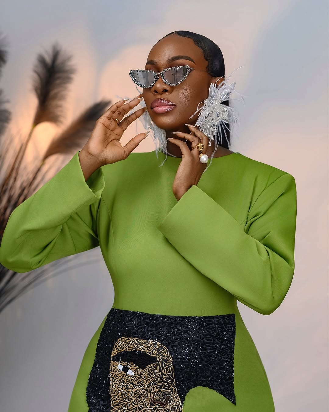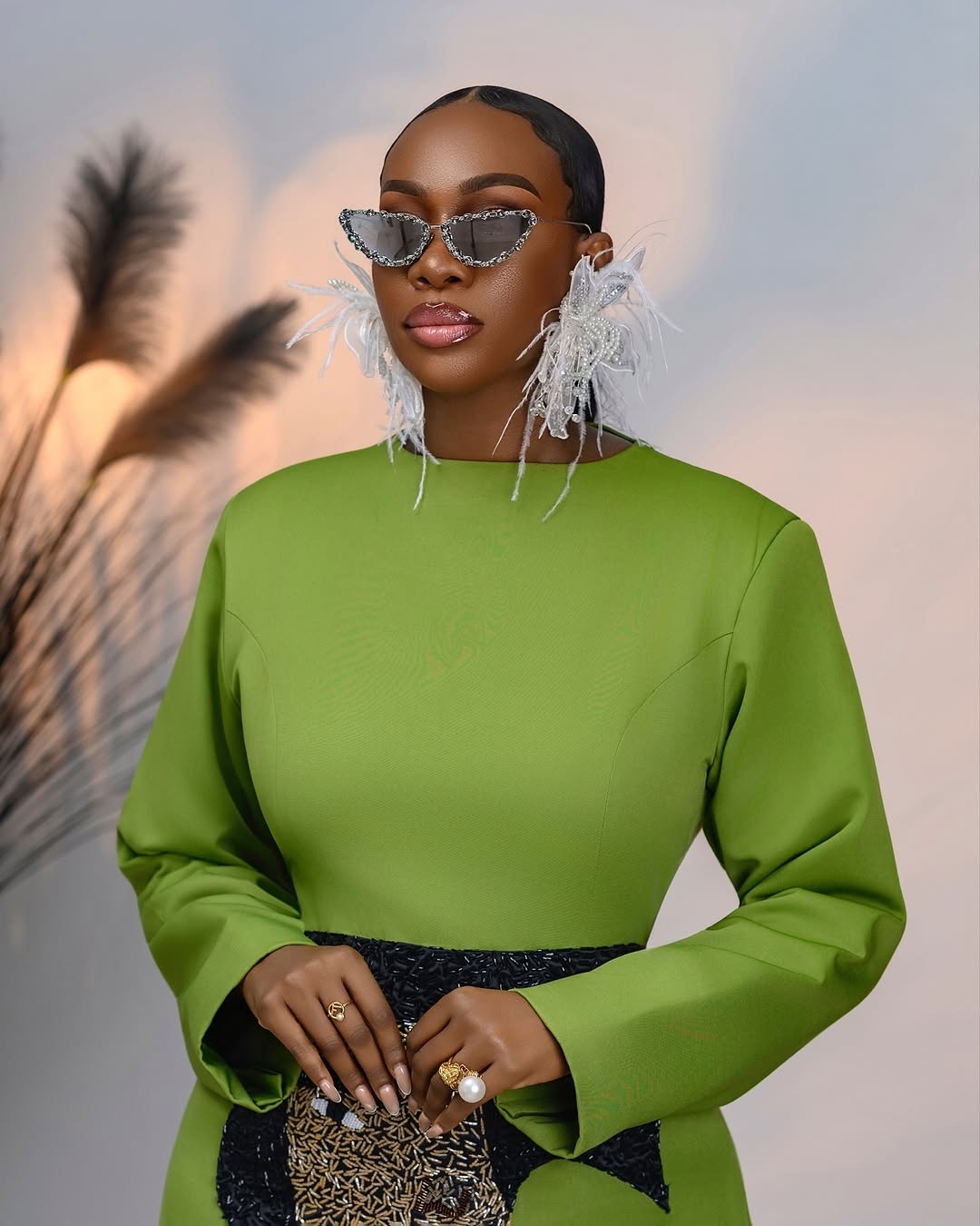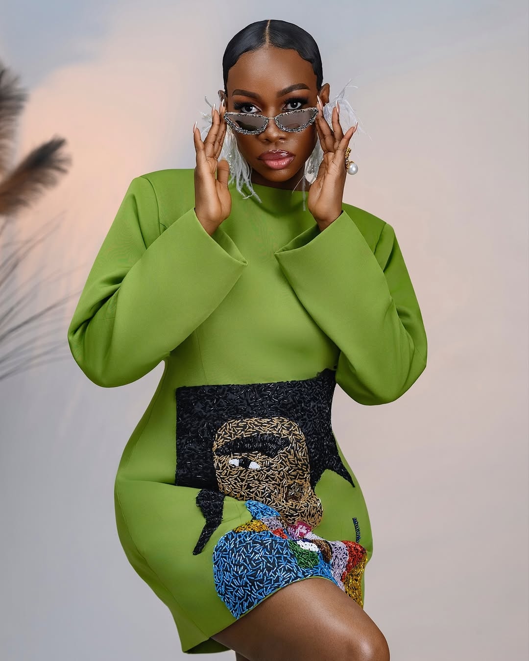 Styled from her collection in a short green dress with wide sleeves and an artwork detail resting across the front, you’d definitely look at the outfit twice. Still, it appeared neat and well put together. It didn’t look like it was begging for attention, everything sat in place. Then came her accessories. She paired the dress with white heels and a white purse. Her dark sunglasses tied everything together, and her pulled-back ponytail suited the outfit.