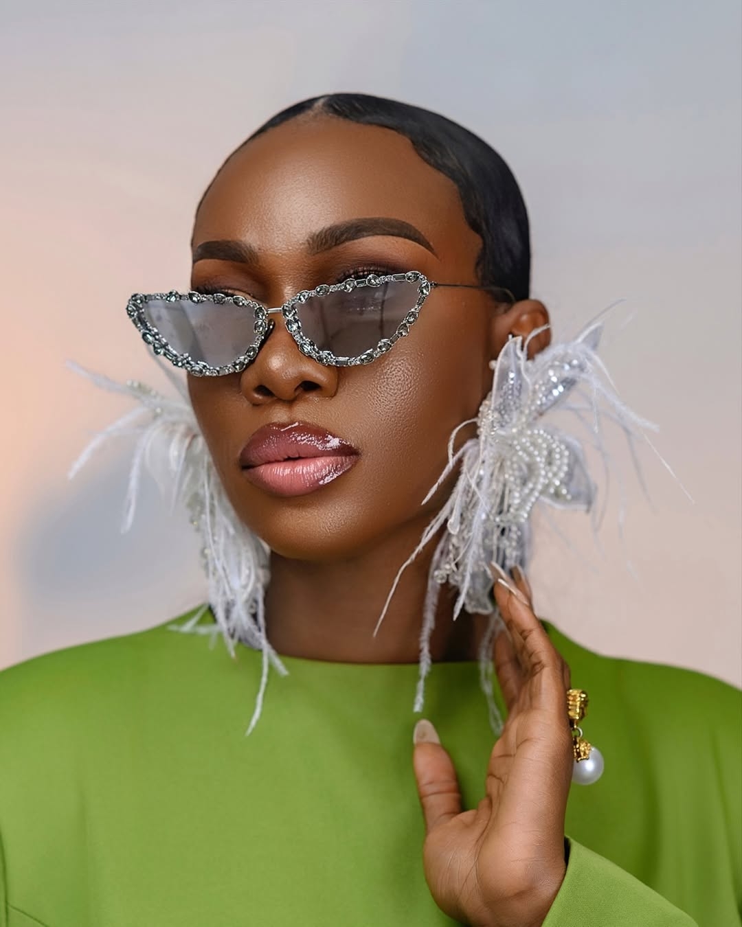 Styled from her collection in a short green dress with wide sleeves and an artwork detail resting across the front, you’d definitely look at the outfit twice. Still, it appeared neat and well put together. It didn’t look like it was begging for attention, everything sat in place. Then came her accessories. She paired the dress with white heels and a white purse. Her dark sunglasses tied everything together, and her pulled-back ponytail suited the outfit.