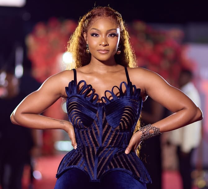 She recently shared photos on her Instagram in a deep blue sculpted midnight gown. The upper part of the gown is a well-structured corset-style bodice with a sweetheart neckline. The chest and midriff have ornate detailing that creates an architectural pattern. The bottom of the gown consists of multiple horizontal tiers of ruffled velvet fabric which add volume and texture to the lower half of the dress. She pairs this look with strappy gold heels, matching earrings and a silver chunky bangle. Her hair? A long, slightly wavy two-toned frontal which blended cleanly with her skin.