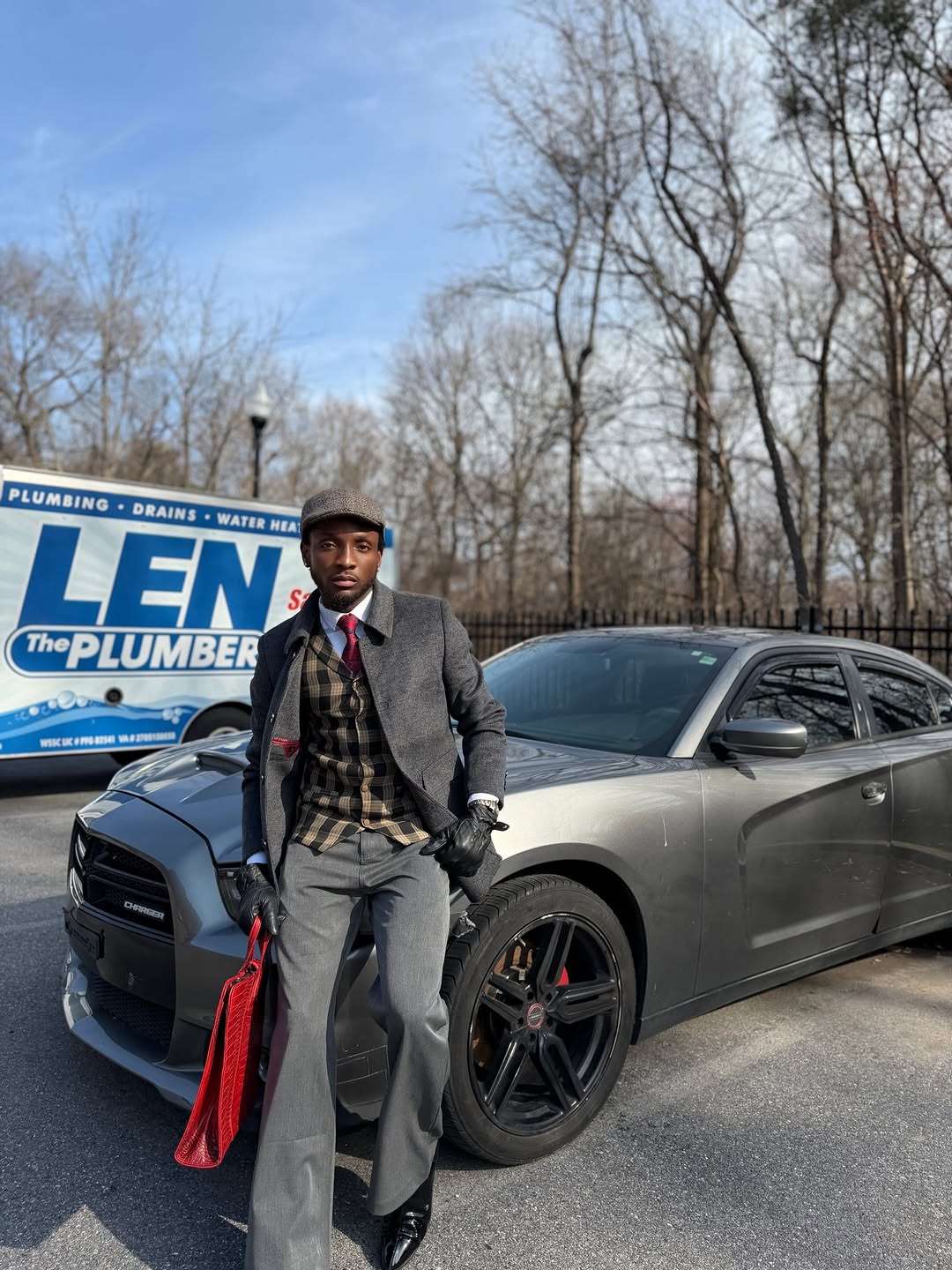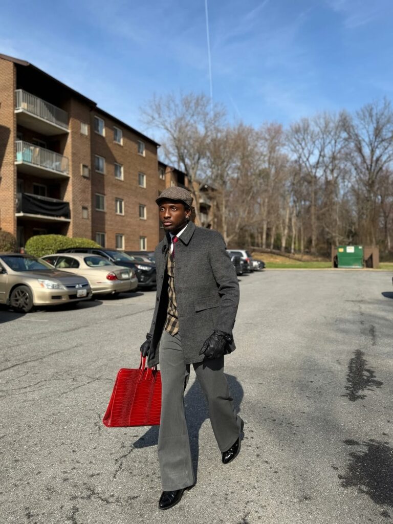 Chimezie accessorized his look with a grey flat cap that complemented his black leather gloves and a bold red Telfer bag as a statement piece. His outfit was completed with black patent leather shoes.
