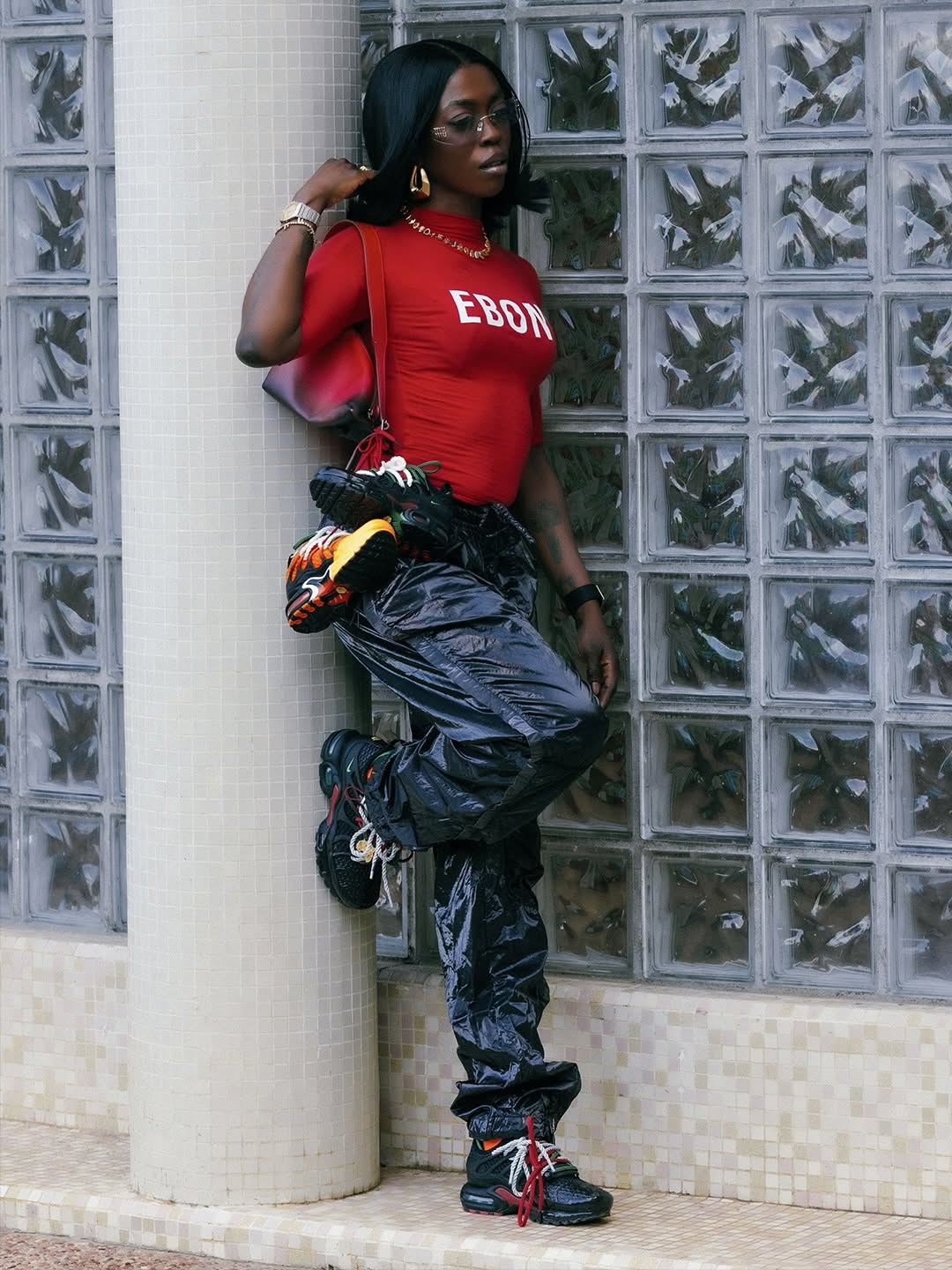 Right here, Kika opts for a sporty yet glamorous vibe. She pairs black cargo pants with a black tank top featuring bold red graphics. Red-and-white sneakers add a pop of color, while her long platinum braids and layered outerwear bring a touch of glam. This outfit is effortlessly cool and elegant on Kika. Outfits like this are Ideal for concerts, travel days, or even casual meet-ups.
