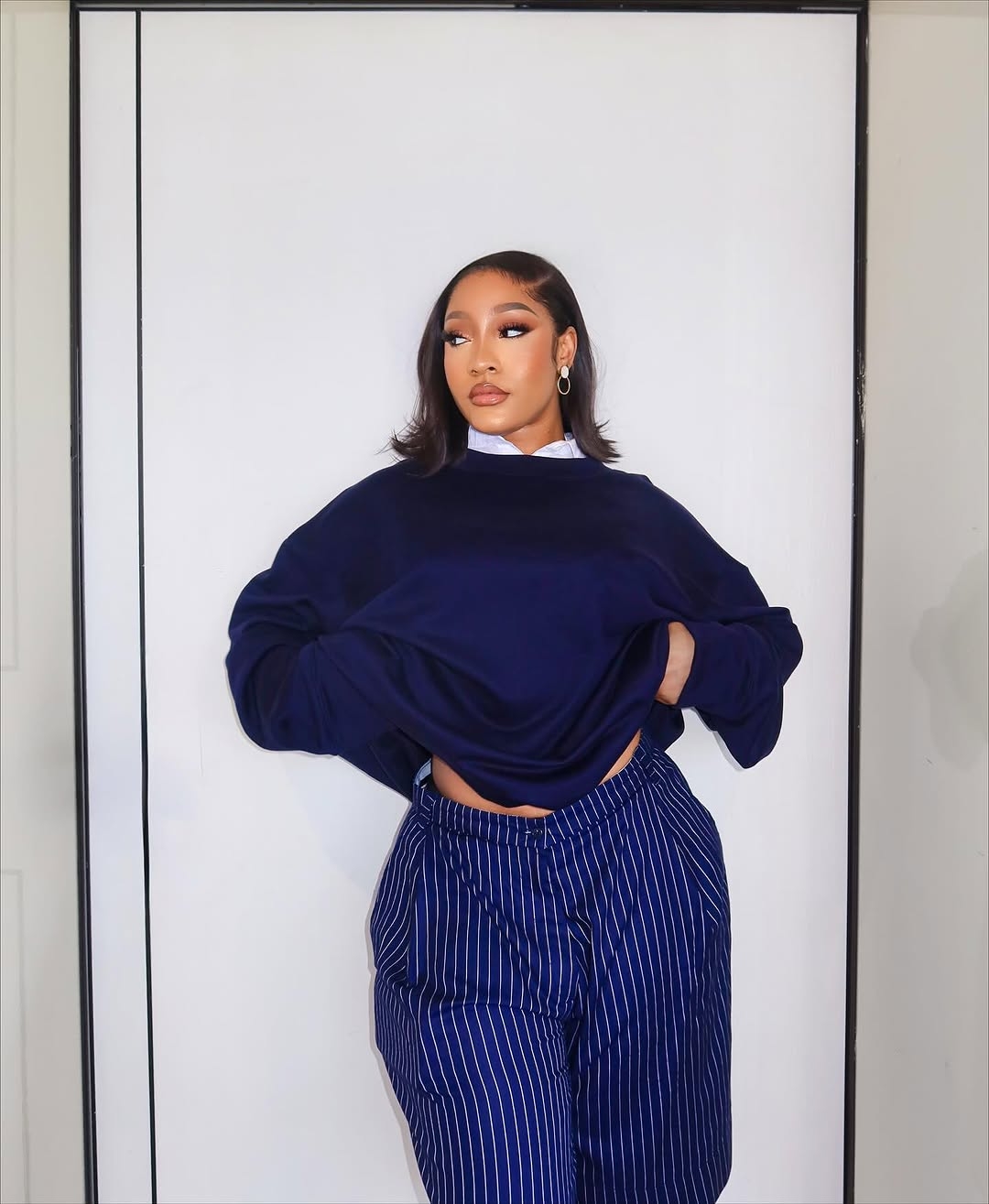 She wore a loose blue top with long sleeves and a simple neckline that flowed naturally over her frame. Yvonne paired it with blue shorts that stopped at mid-thigh.