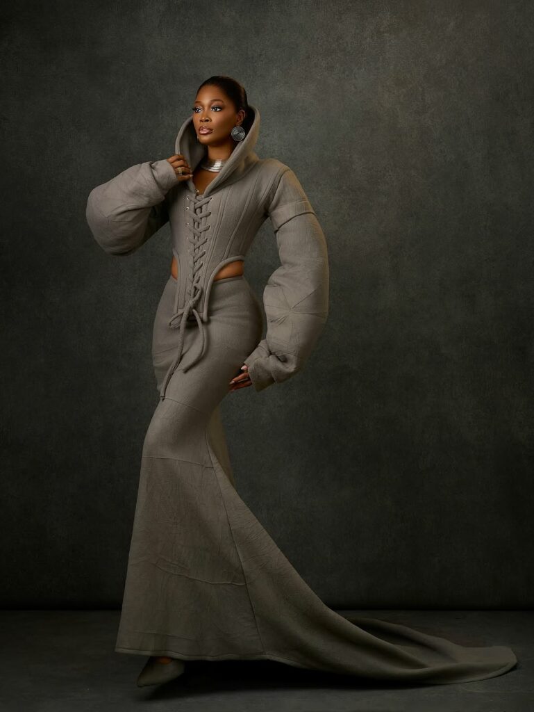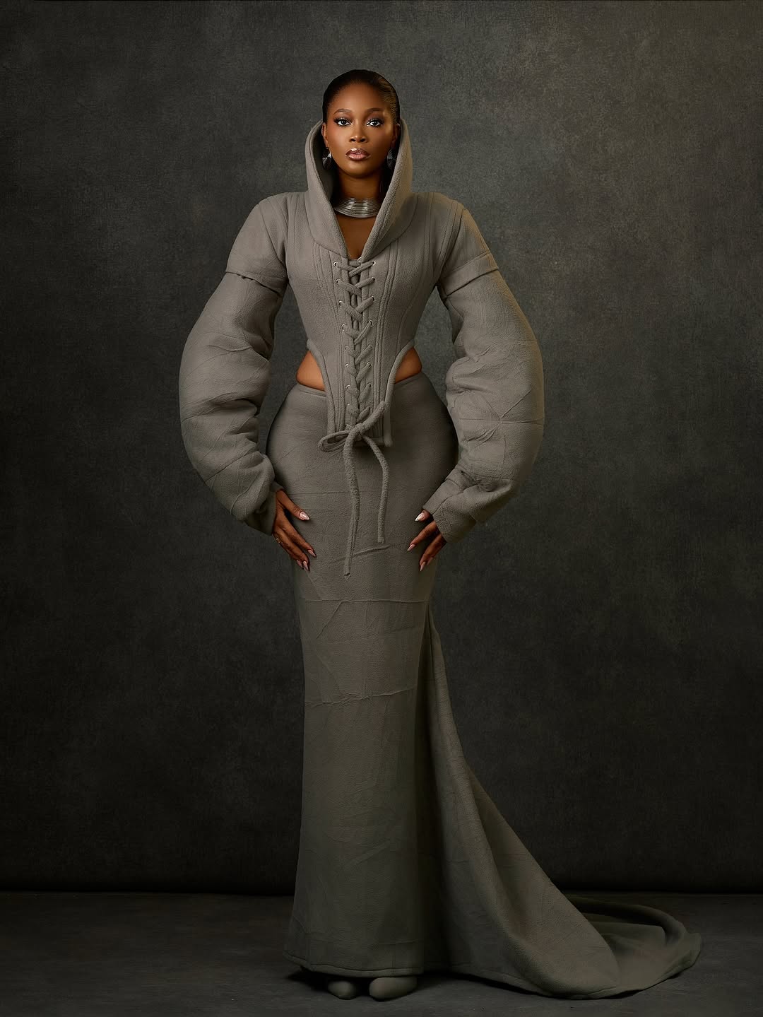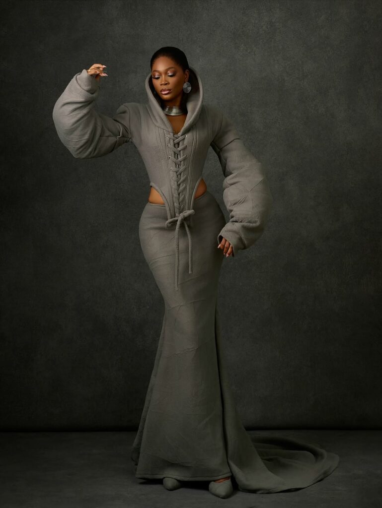 This time she went with an avant-garde outfit known as the corset-inspired sculpted gown, the outfit was designed and styled by Josiphiah Michael. She wore a olive-grey corset-style top with high collar that frames her face. It has front lace-up detailing with thick grey cords and daring side-cutouts that reveal her waist. The sleeves are oversized and structured with quilted structure, creating a dramatic shape.