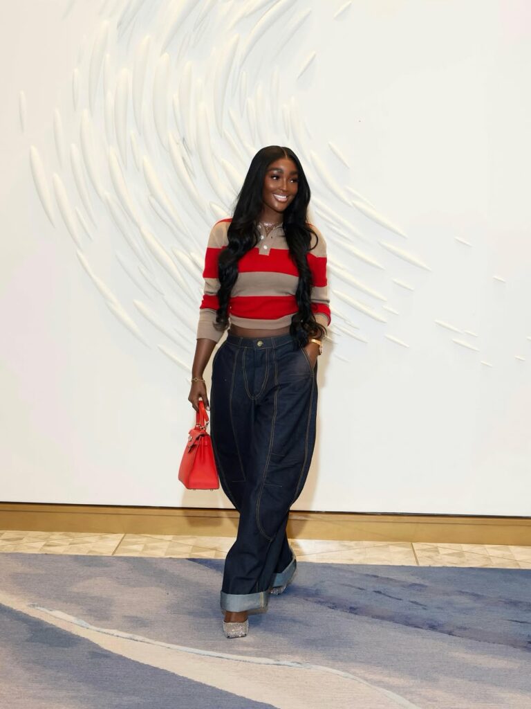 She styled them with a cropped red and beige striped polo shirt, a mini red Hermès Kelly bag, crystal pointed-toe heels, a gold wristwatch and layered necklaces.