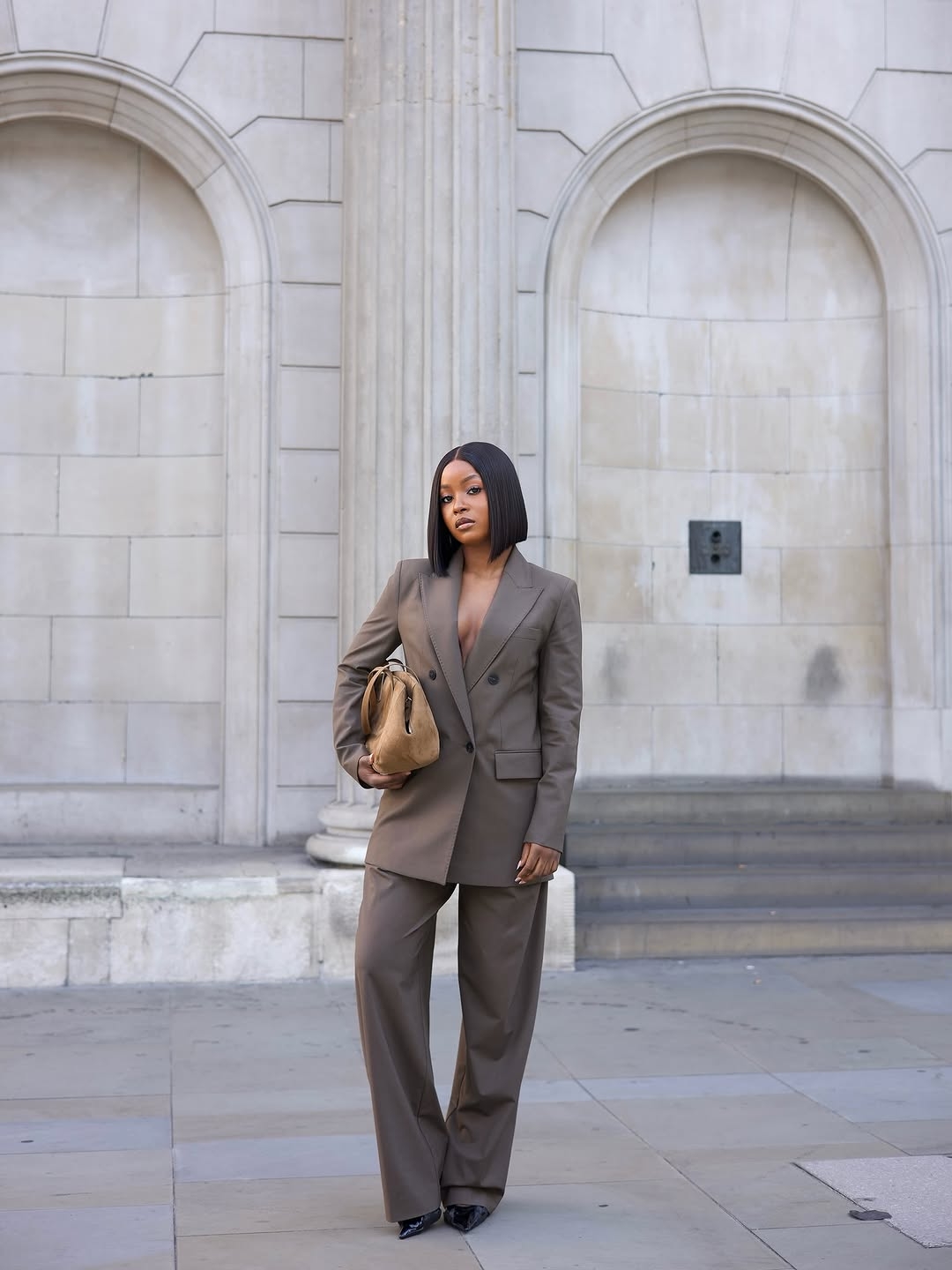 On the streets of London, Bella stepped out in a brown oversized suit that flattered her frame, while her loose wide-leg pants added a relaxed edge.
