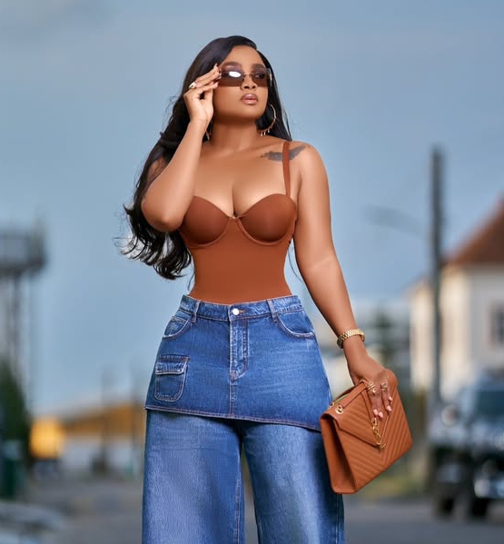 She wore a brown body shaper over the blue low-rise jeans from Adunnis Closet. Instead of pairing them with ultra-short tops, she went with a more relaxed silhouette above the waistline. This small decision softened the usual sharpness that low-rise jeans often bring.