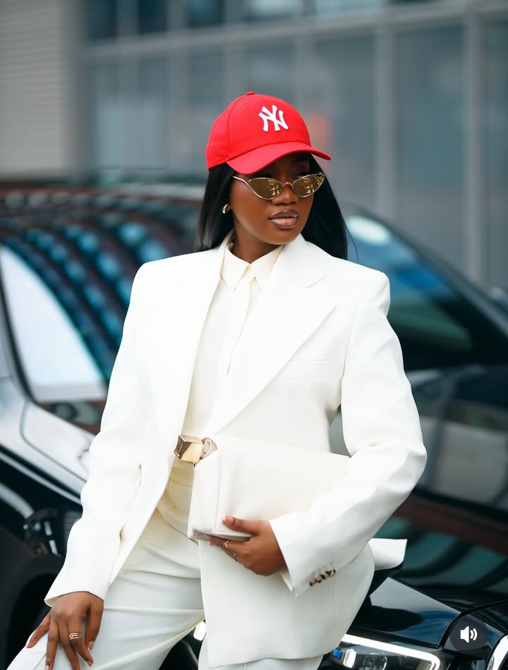 The pant suit is a loose-fitting, oversized white blazer, a matching button-down inner shirt worn under the blazer and wide-leg trousers. Where most people would pair this look with safe choices like a neutral heel or a metallic clutch, Chinenye Nnebe takes it up a notch by making a revolutionary difference by pairing this look with a red baseball cap and a matching Adidas branded canvas transforming a potentially formal outfit into a defiant streetwear style.