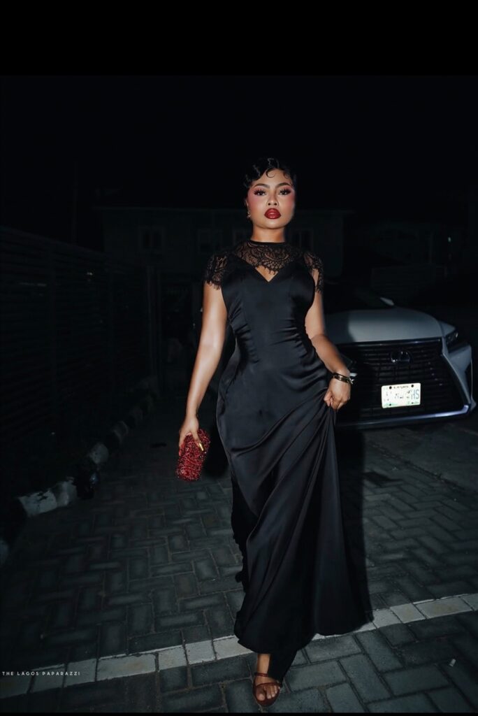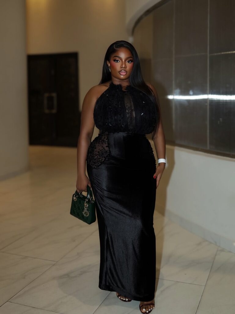 Other Nollywood celebrities also wore evening gowns including Dorathy dazzling in a black velvet and lace gown from Haven. The outfit featured a halter neckline, sheer mesh detailing and black floral appliqués creating texture and dimension.