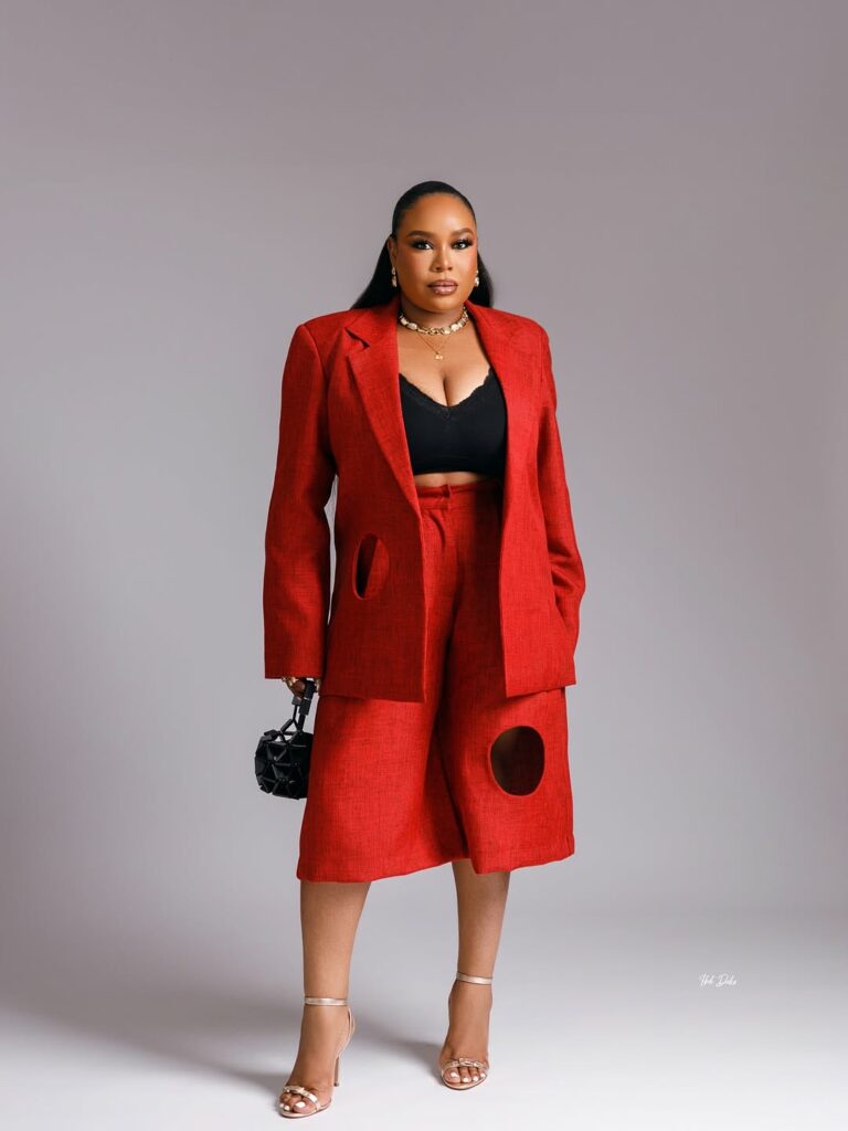 In contrast, Mimi Onalaja wore a custom-made, textured red pantsuit set from FIA. She wore an oversized red blazer with circular cut-outs, styled over a black trimmed bralette and matching wide-leg red bottoms at knee length.