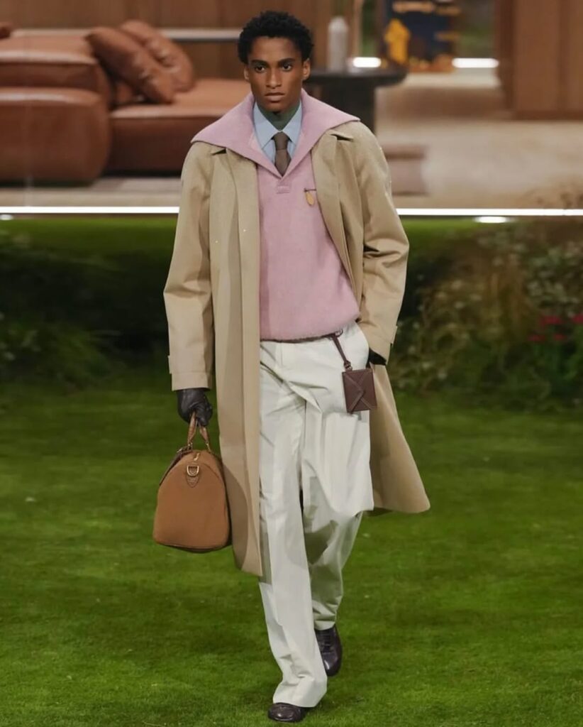 The Louis Vuitton Men’s FW26 runway was striking, featuring a purpose-built structure that framed the presentation with both precision and creativity. Models moved through green lawns and architectural spaces, allowing the clothing to interact naturally with the environment. The collection combined classic shapes with subtle contemporary details, balancing restraint with expressive touches.