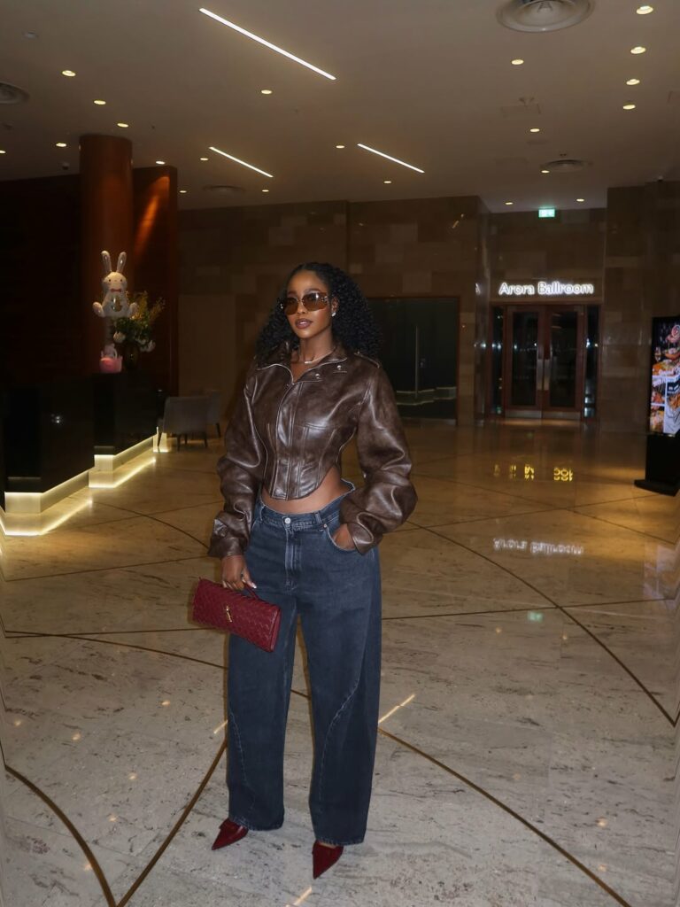 Lily’s makeup centred on warm earth tones, paired with smoky eyeshadow and a nude-to-brown ombré lip gloss. Her hair was styled in into tightly coiled curls with a clean middle part, she completed her look with burgundy patent leather pointed-toe heels, the deep wine hue of her bag was mirrored cleanly by her pumps which added a clean edge to the casual denim.