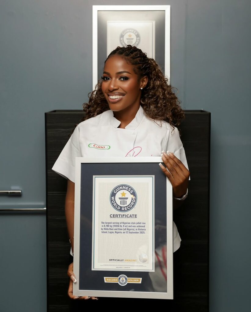 The record is linked to an event she hosted on September 12, 2025 at Eko Hotels and Suites, Lagos. That day, Hilda partnered with Gino to prepare a large serving of jollof rice, weighing 8,780 kilograms, which set a Guinness World Record at the time.