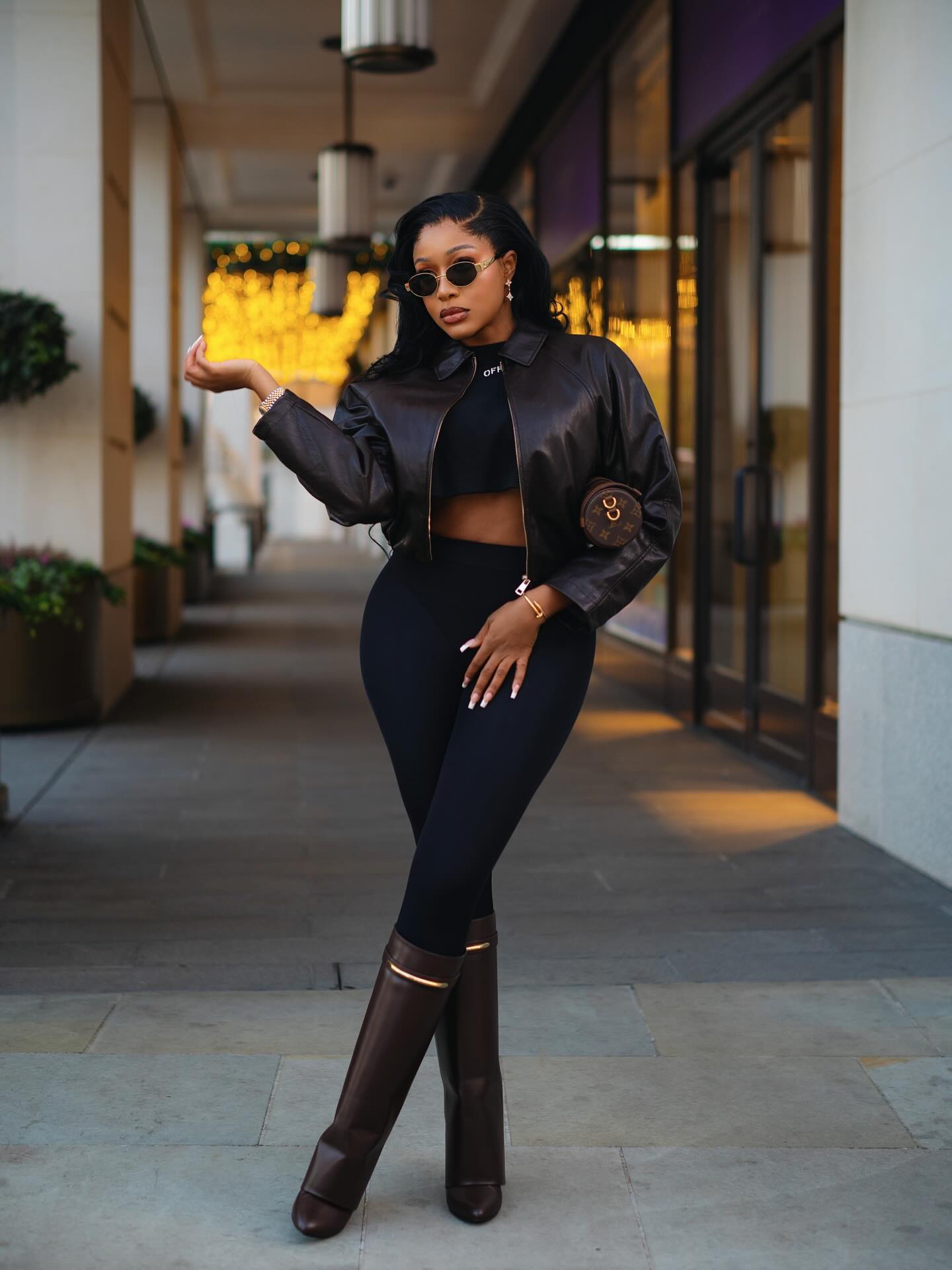 The cropped dark leather jacket sets the tone for the look. Its firm shape outlines the upper body, creating a controlled shoulder line while narrowing visually at the waist. By keeping the jacket short and clean-cut, she creates a clean line that naturally draws the eye to the fitted black top beneath it. The mix is clean and purposeful, so the outfit feels focused.