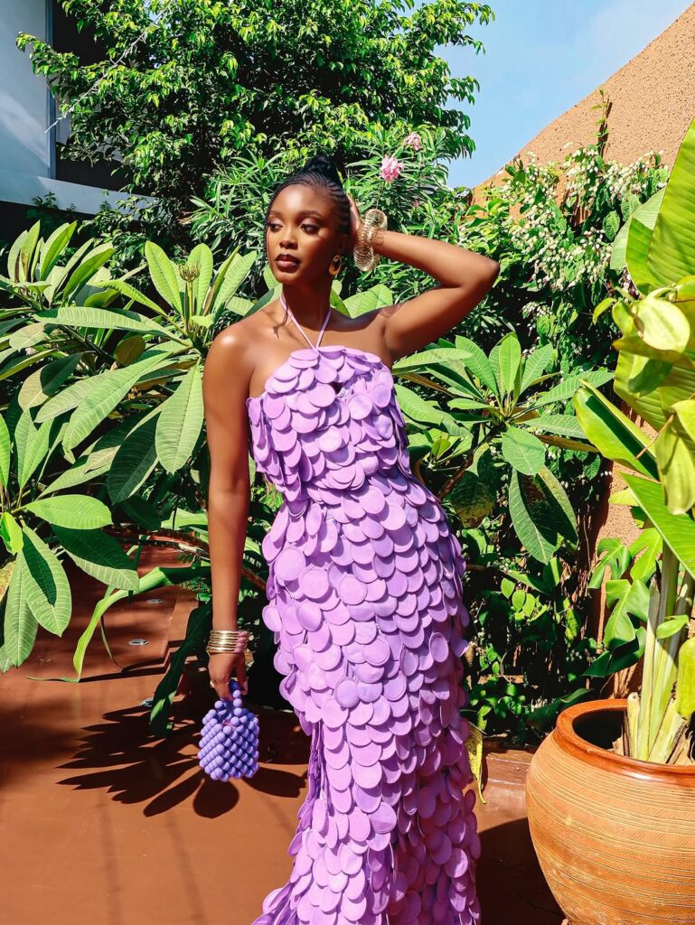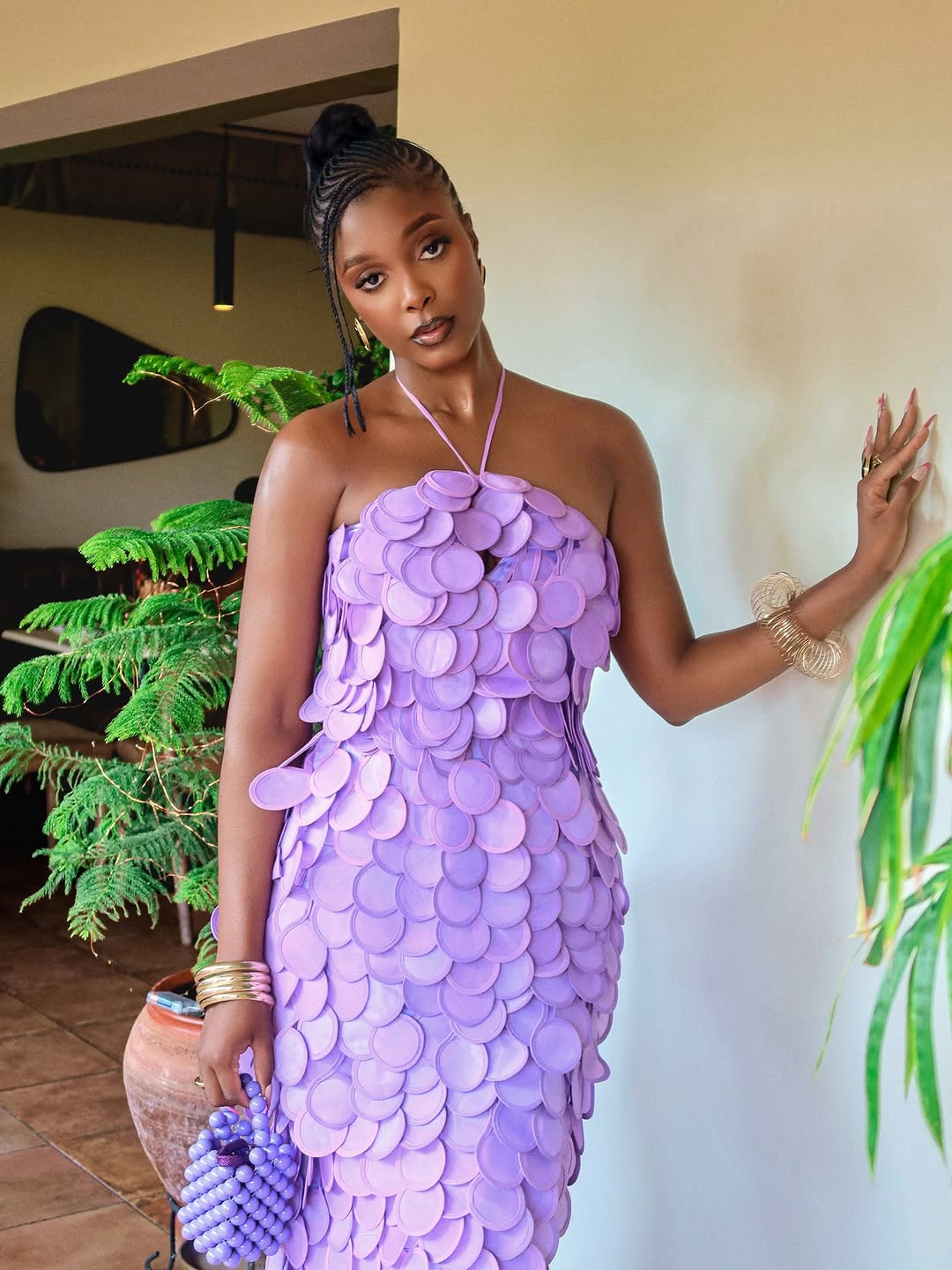 Styling complements the dress. Gold bangles add a hint of warmth, while a lilac-toned mini bag matches the outfit. Her hair is arranged into a cornrow updo that enhances the dress.