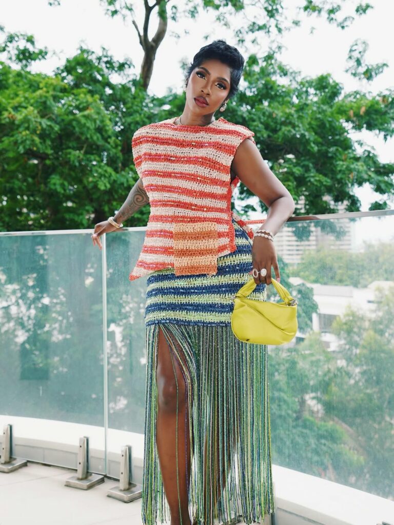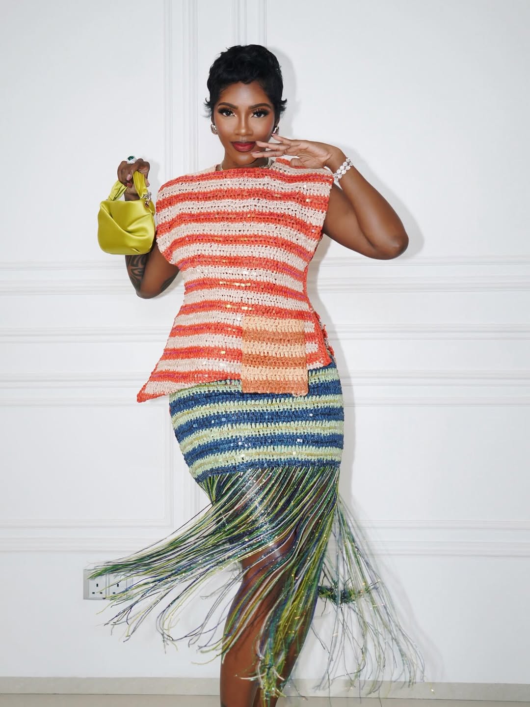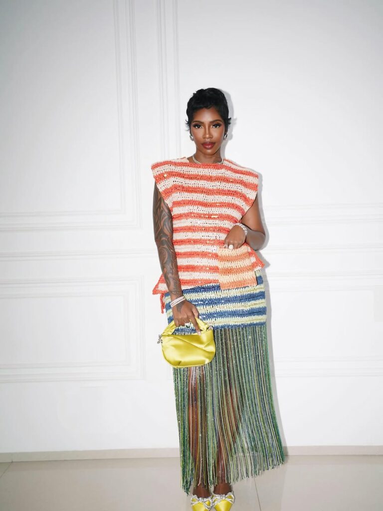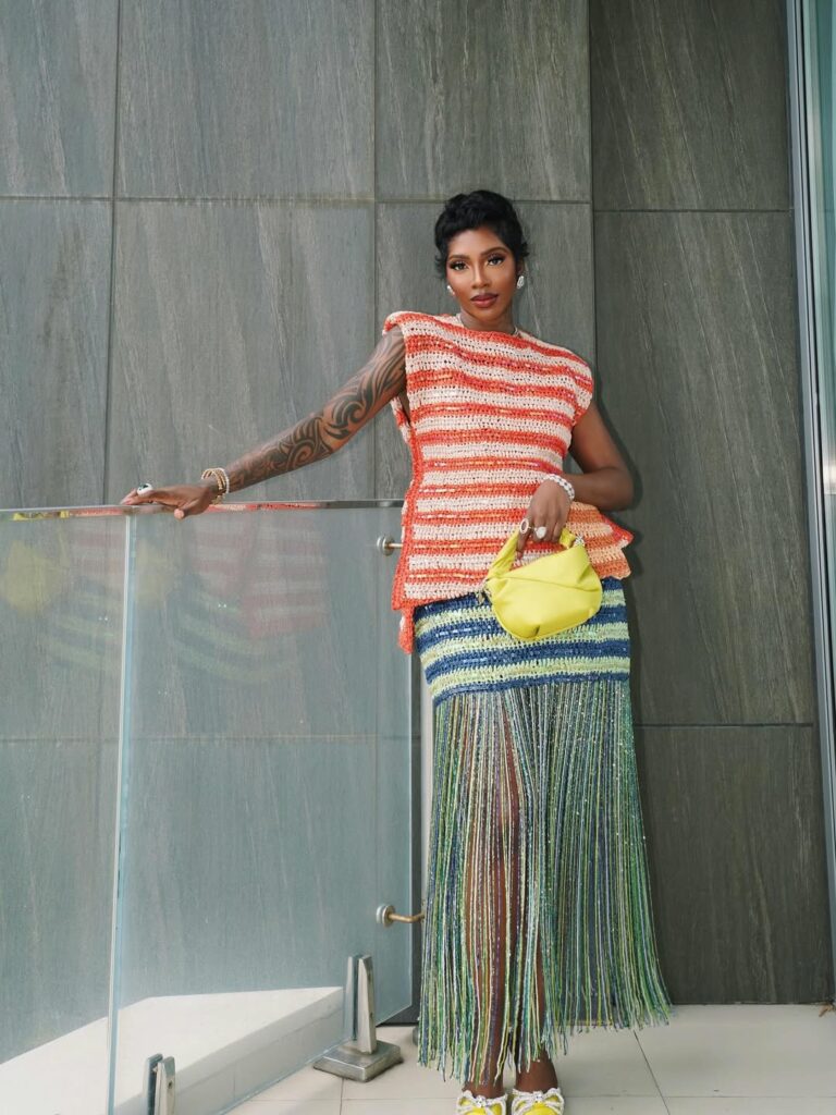 At the event, she wore a sleeveless crochet top which had alternating horizontal stripes of bright orange and crisp white. The piece was accented with simple beaded embellishments, a signature of the Lisa Folawiyo brand. Tiwa paired it with a matching high-waisted striped skirt that transitioned from blue and yellow tones into a floor-length fringe hemline. The fringe created a glittering effect, adding movement across the hemline and the shape of the outfit.