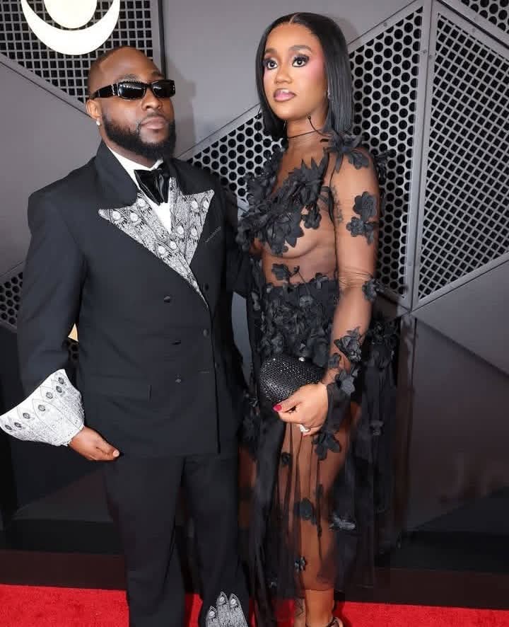 Davido, who was nominated for Best African Performance for his song “With You” featuring Omah Lay, attended the ceremony alongside Chioma and wore a sharply tailored black double-breasted suit detailed with ornate silver embroidery across the lapels, cuffs and hem. Chioma opted for a sheer black gown with lace panels and black 3D floral appliqués across the bodice and skirt. The high neckline and long sleeves contrasted with the sheer fabric