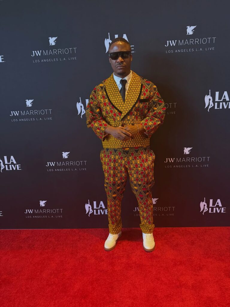 Jaywon wore a patterned Ankara blazer, blending traditional African prints with modern tailoring, paired with tailored trousers, a white shirt, black tie and white sneakers for a contemporary red-carpet look.