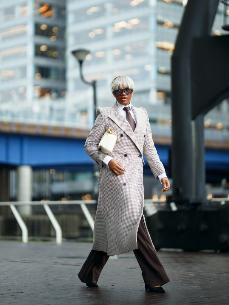 Beneath the coat, she wore a crisp white button-down shirt paired with a solid brown tie, adding a clear touch of formal styling. The lower half of the look featured loose-fitting, wide-leg chocolate brown trousers that worked well with the neutral tones in the coat’s pattern. She finished the outfit with a structured white clutch bag and oversized dark sunglasses, balancing everything quietly.