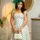 What makes her dress stand out? The style. Her dress is short, with a well structured silhouette, and long flared sleeves. It features a symmetrical button-up illusion closure on the front. She completes this look with a pair of sunglasses and a blue pointed toe heel. The pink colour choice added a touch of femininity and glamour to her overall look. The blazer accentuates her curves so beautifully giving room for her long, slender legs to take the center stage.
