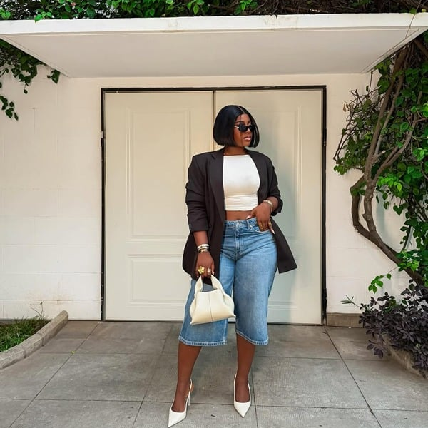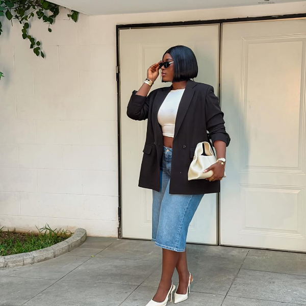 Oyindamola Eyitayo Idowu revisits the jorts trend in her latest Instagram post, captioned “Here to Ruffle Your Feathers.” The combination pairs mid-length denim shorts with a fitted cropped top and an oversized blazer with defined shoulders, giving the throwback staple a more tailored finish.