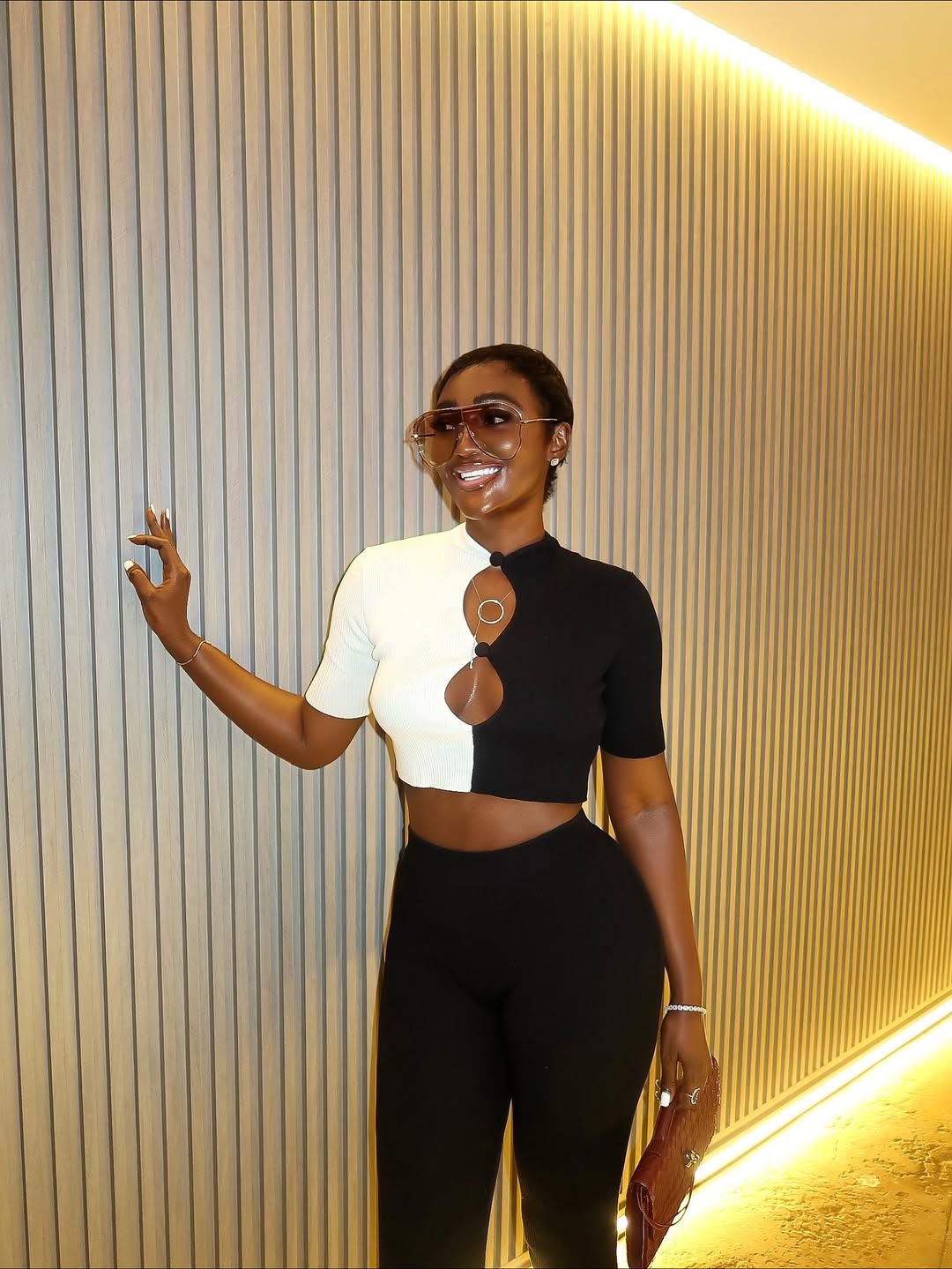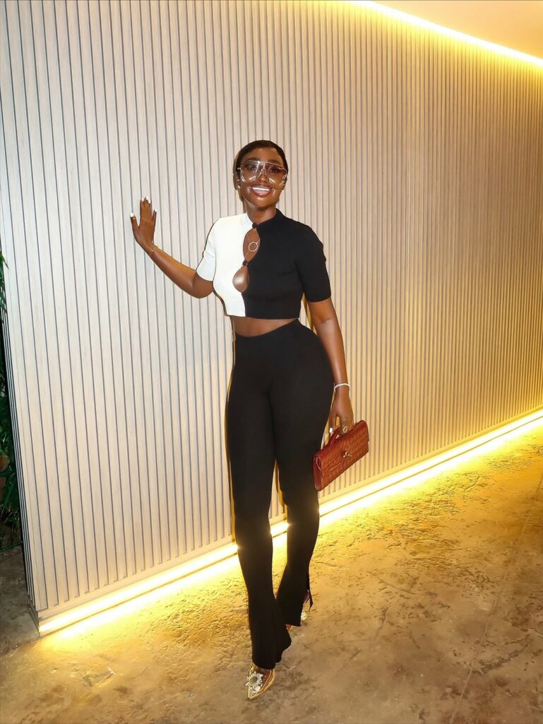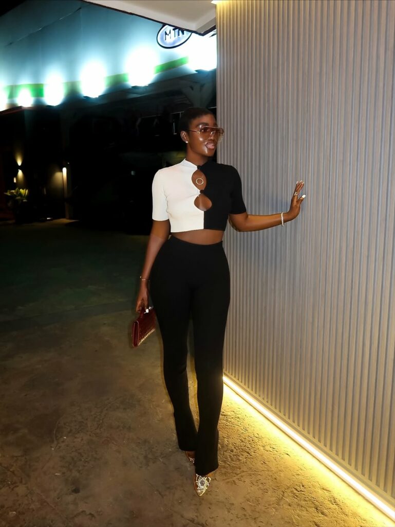 Wearing a striking two-tone design by @akemmaofficial, Bally appeared calm, assured, and undeniably stylish. Her cropped top, half black and half white with a circular keyhole detail, struck the right balance between daring and refined. She paired it with tailored, high-waisted black trousers that lengthened her frame and carried a crisp, structured rhythm. Together, the pieces shaped a clean outline that was sharp without being harsh.