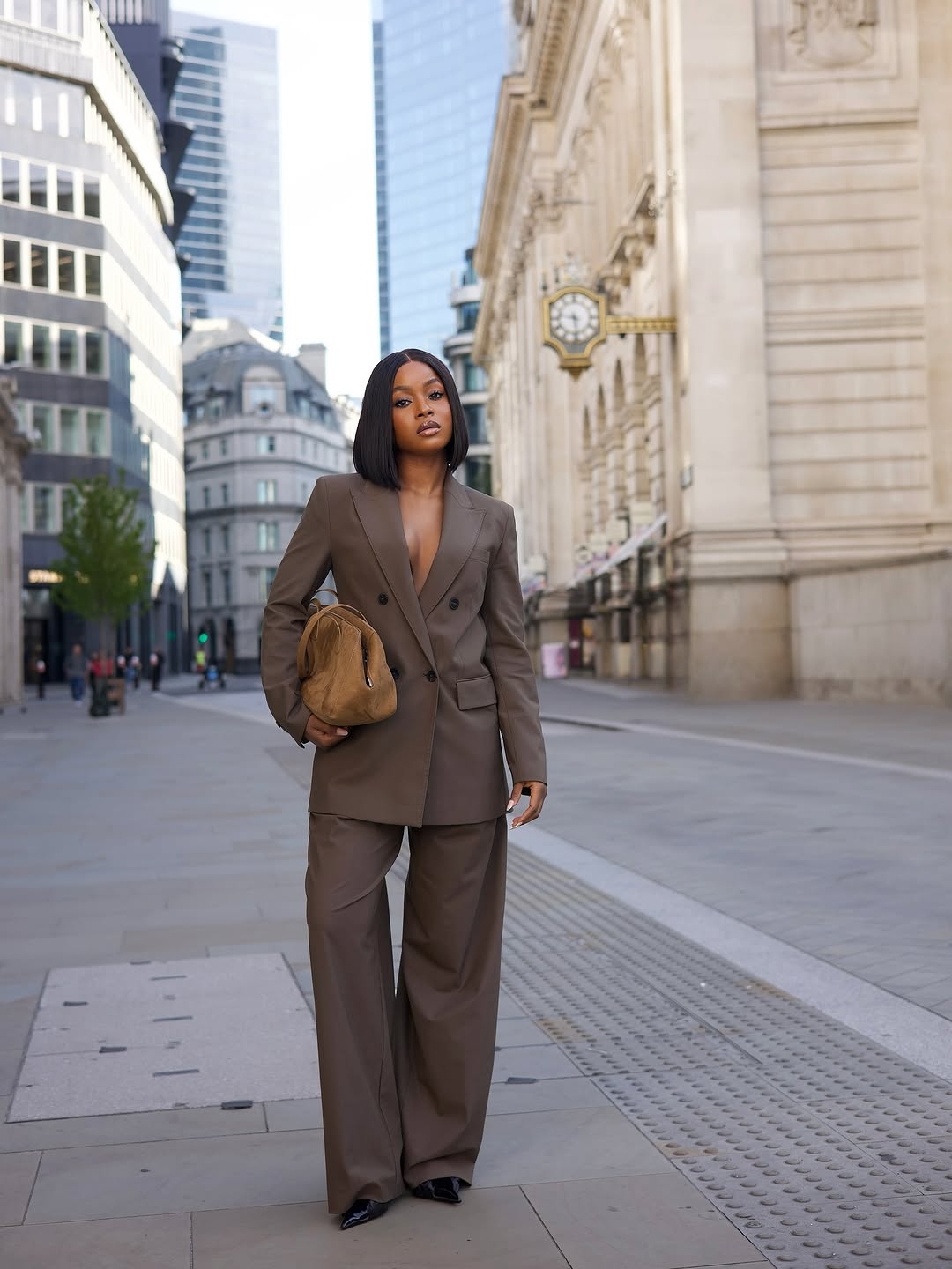 On the streets of London, Bella stepped out in a brown oversized suit that flattered her frame, while her loose wide-leg pants added a relaxed edge.
