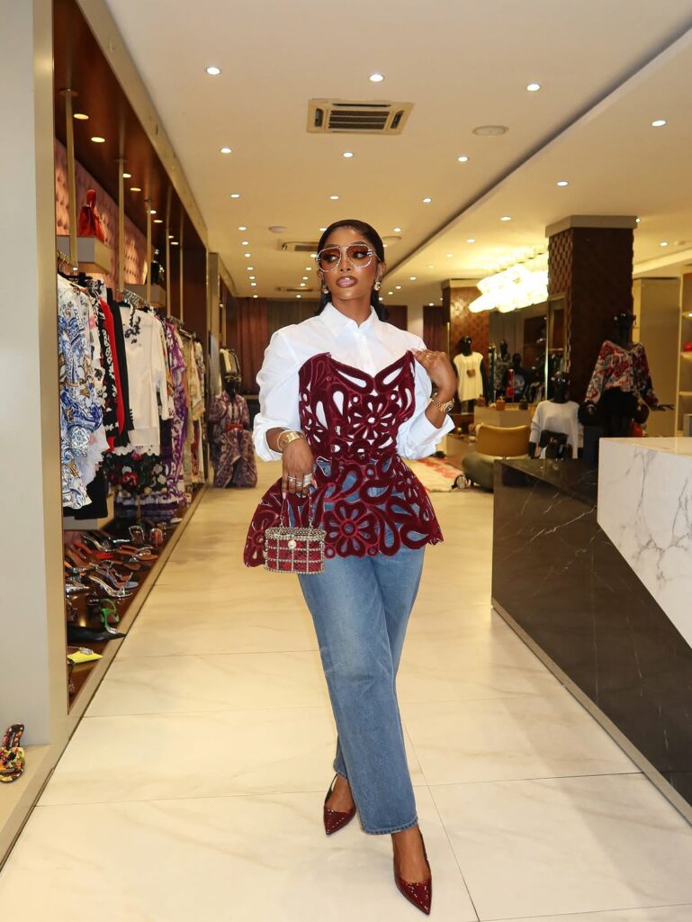 Her shoes match the corset in the same burgundy colour. They are pointed-toe heels from Gucci. She accessorized the fit in a simple way, sunglasses, gold statement bangles, a gold wristwatch and rings. Chioma complemented the look with a small structured red handbag with tiny crystals detailing on it. Her hair was styled neatly in a smooth low ponytail. Chioma’s makeup was done simply with softly defined brows, warm tones and a nude coloured lipstick to finish.