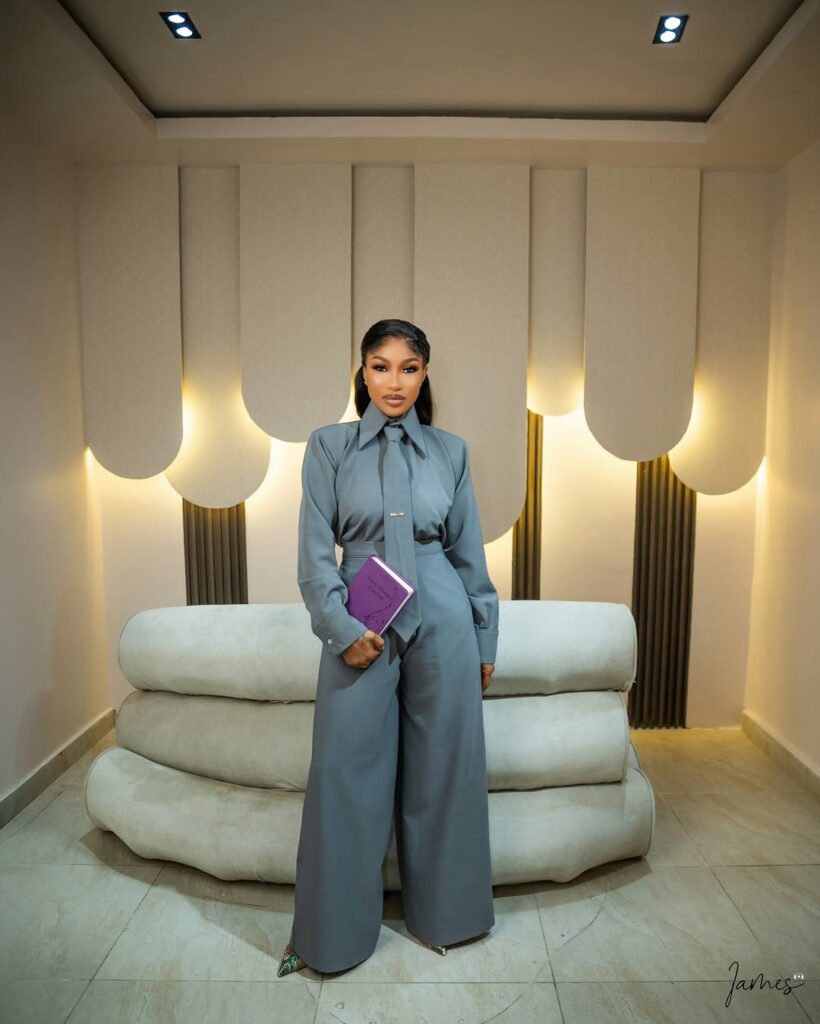 Tonto Dikeh’s monochrome look was very well put together. It didn’t do too much, it was versatile in its own way. By adding the purple Bible and green heels, she introduced some variety to the outfit. This blue outfit continues her recent styling content. She carefully considered the colour, fabric and coordinating accessories.