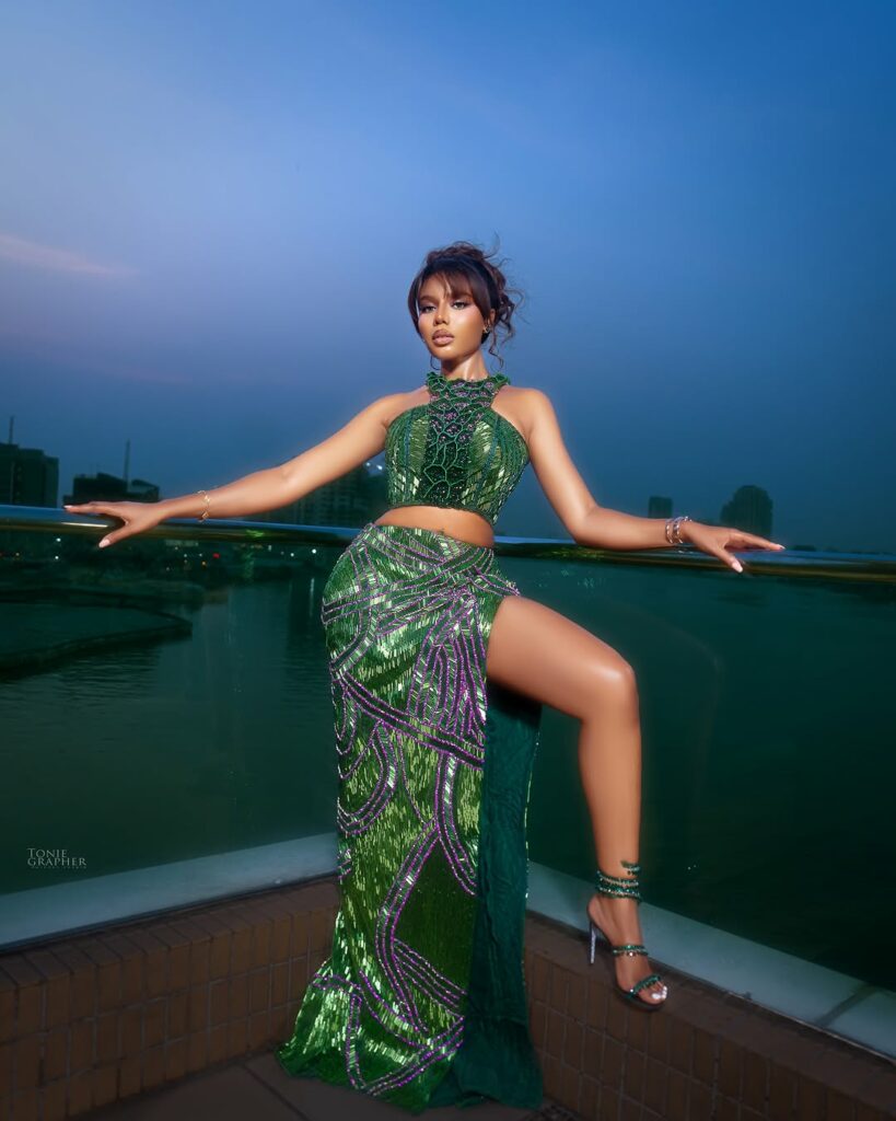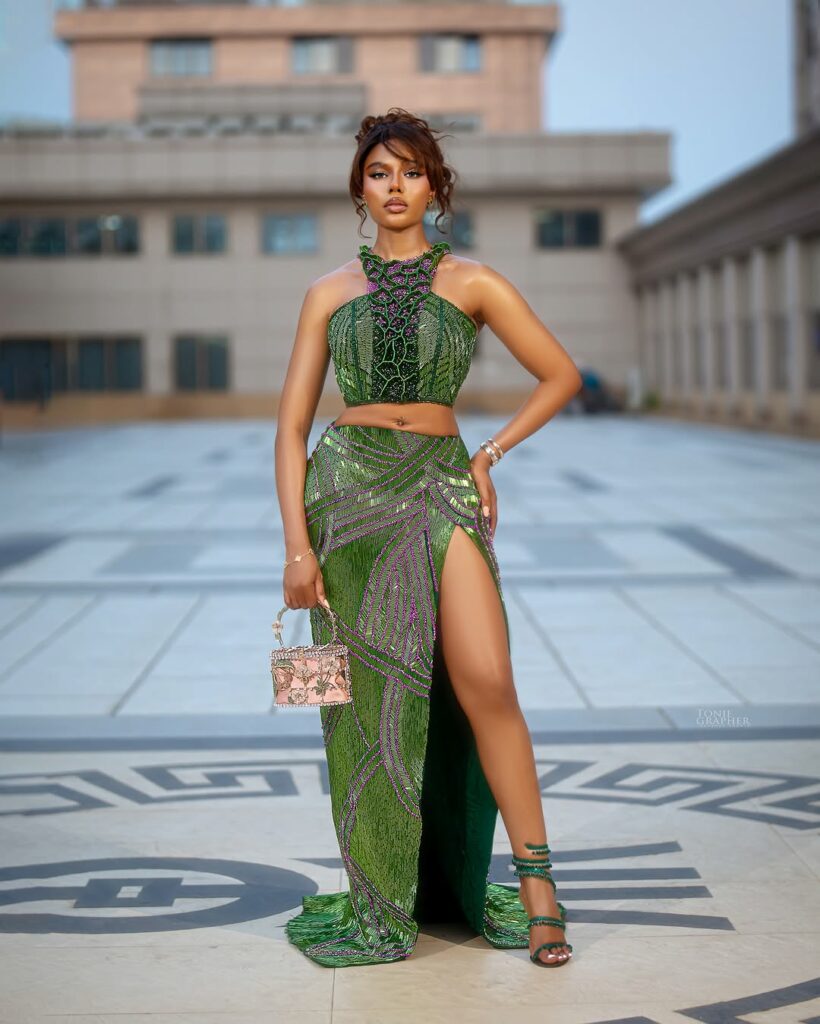 Nancy Isime appeared in a sharply constructed look. On January 30, 2026, she wore a green and lilac two-piece outfit with a sleeveless, high-neck crop top in lilac accents, paired with a floor-length skirt that had a high slit on one side. The skirt had a geometric pattern that matched the designs on the top.