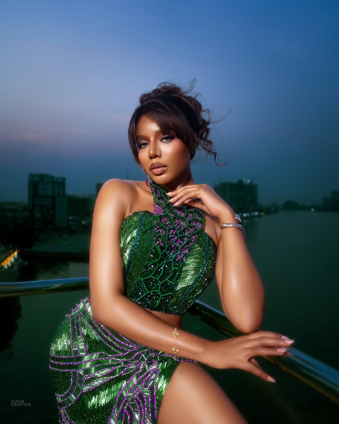 The green and lilac paring stood out. Her hair was styled in a loose updo, with soft curls framing her face. Her makeup, done by Bibyonce was natural with defined brows, soft eye makeup, and nude lipstick