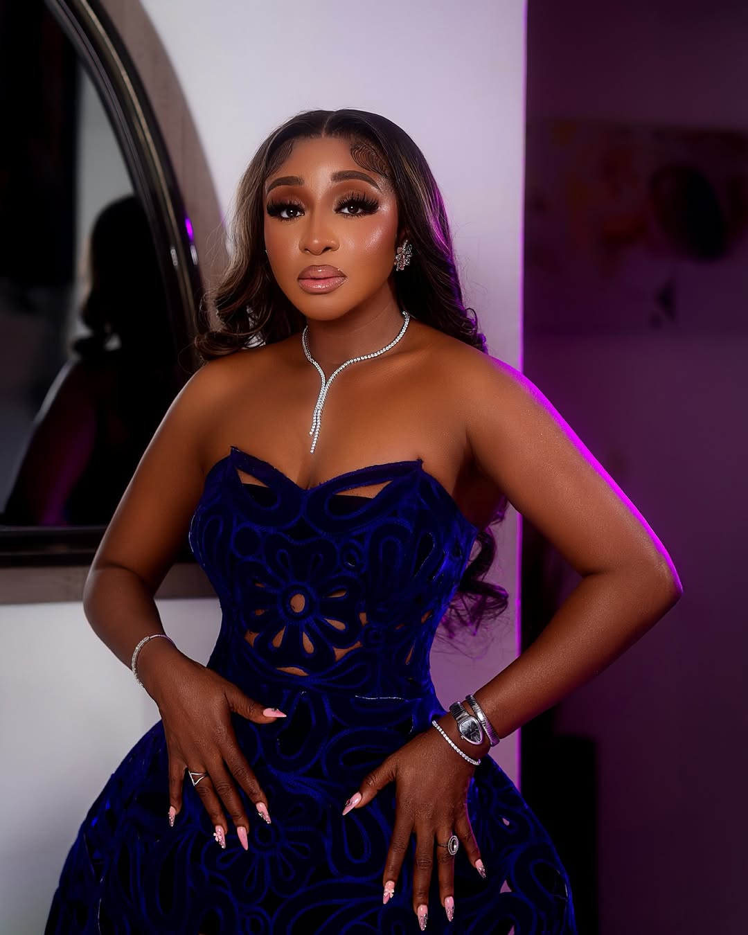 Ini Edo arrived wearing a dark royal blue laser-cut mini dress with a fitted strapless bodice and a flared skirt,defined by intricate cut-out patterns that create a sheer effect over its lining