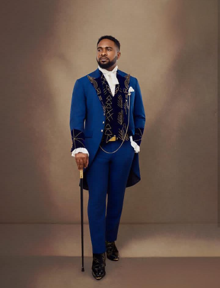 Uzor Arukwe arrived looking assured. His outfit did not fight for attention. He wore a tailored deep blue tailcoat featuring intricate black and gold embroidery on the cuffs and collar and matching pants. A waistcoat with gold and white pattern in front. The shirt was a white, high-collared dress shirt with cravat at the neck. He was accessorised with black glasses, formal shoes, a gold chain detail on his jacket, and a black walking cane. The outfit sat well on his frame and kept proportions intact.