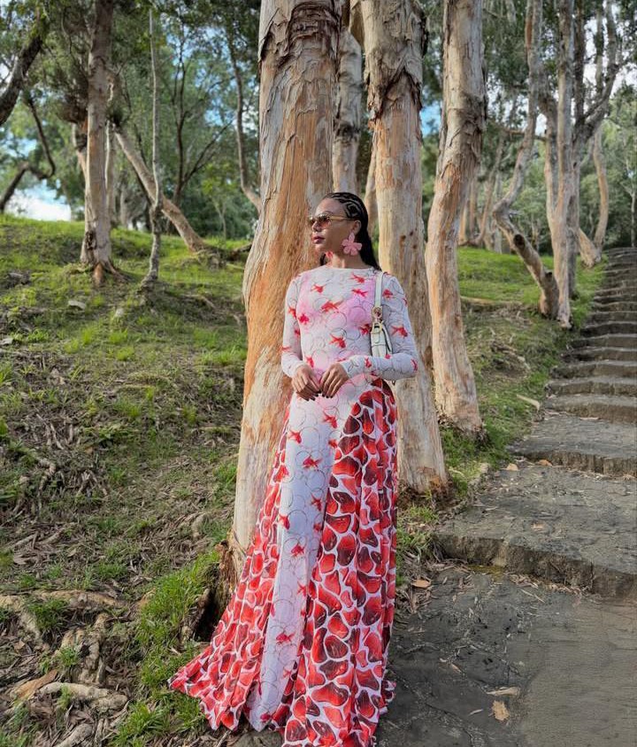 Her third outfit features a flowing, high-necked, long-sleeve gown with floral patterns. A perfect fit for strolling through nature. The gown is a mix of white and red. She styled this look with a white shoulder bag and sunglasses