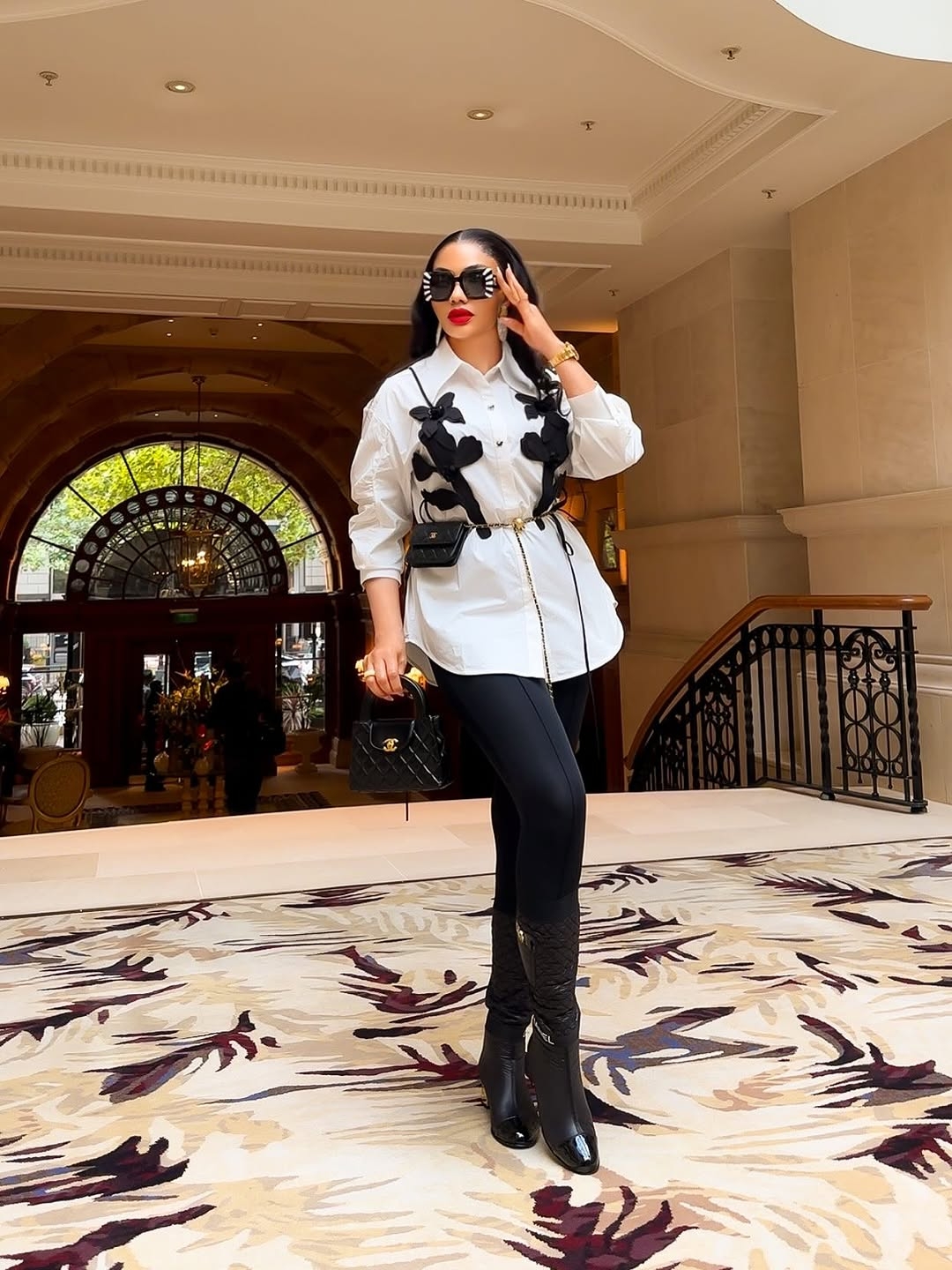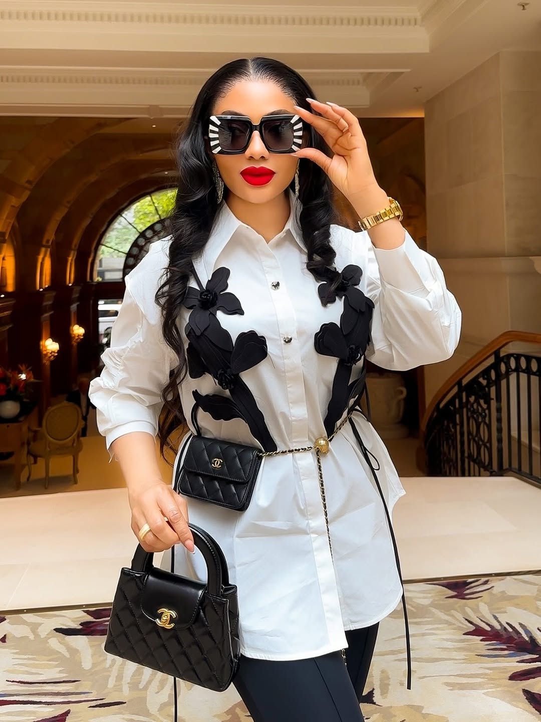 Regarding accessories, Nimi was not carrying much – just a mini black Chanel bag, a pair of sunglasses that had white stripes at the side, and a gold wristwatch on her wrist.