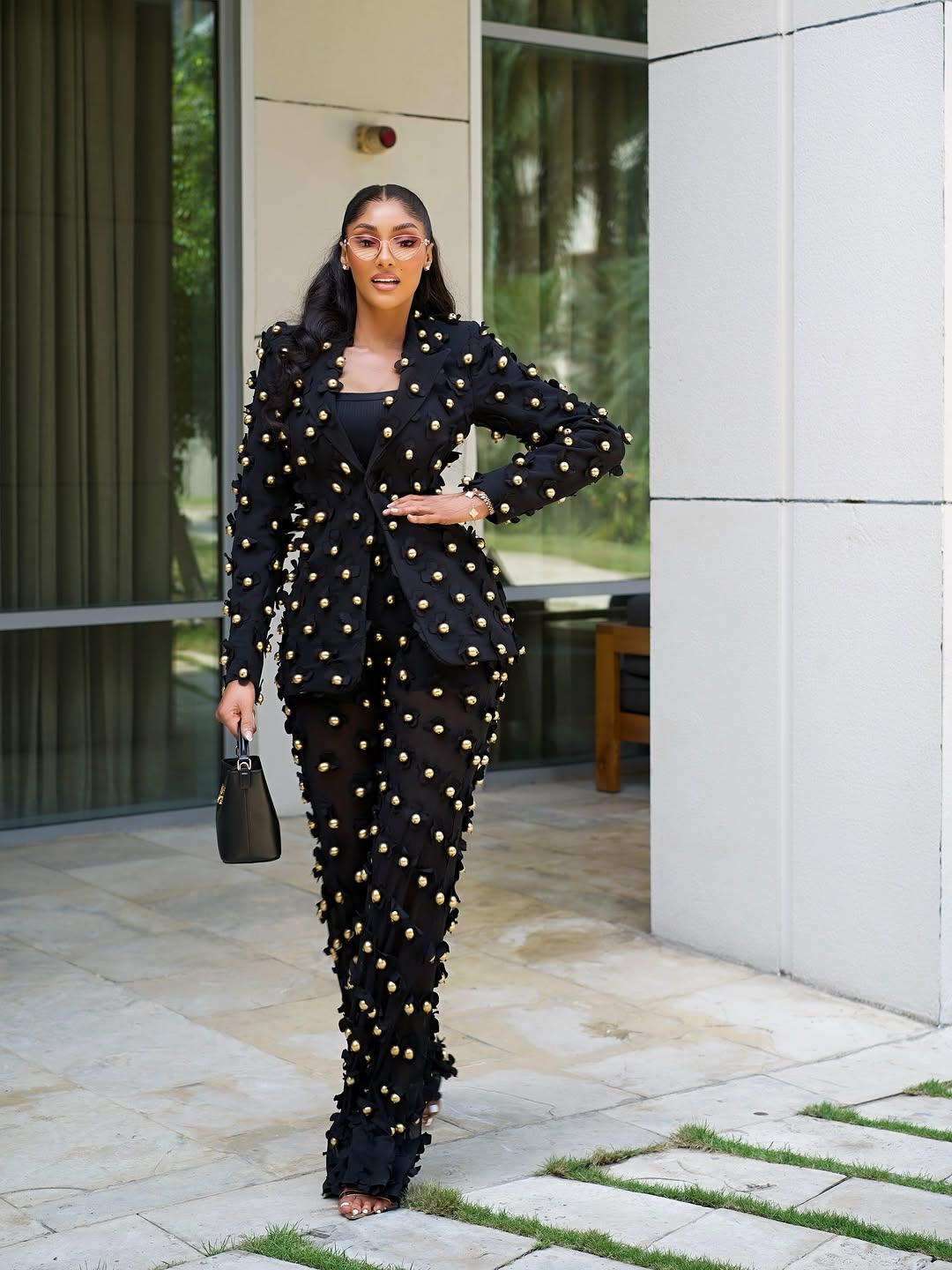 In day two at the global entrepreneurship festival 2025, Delonyii stepped out in a medlinboss outfit. She wore black two-piece suit with gold ball designs on the jacket and trousers. She paired it with a compact black handbag, tinted sunglasses, and high ponytail.