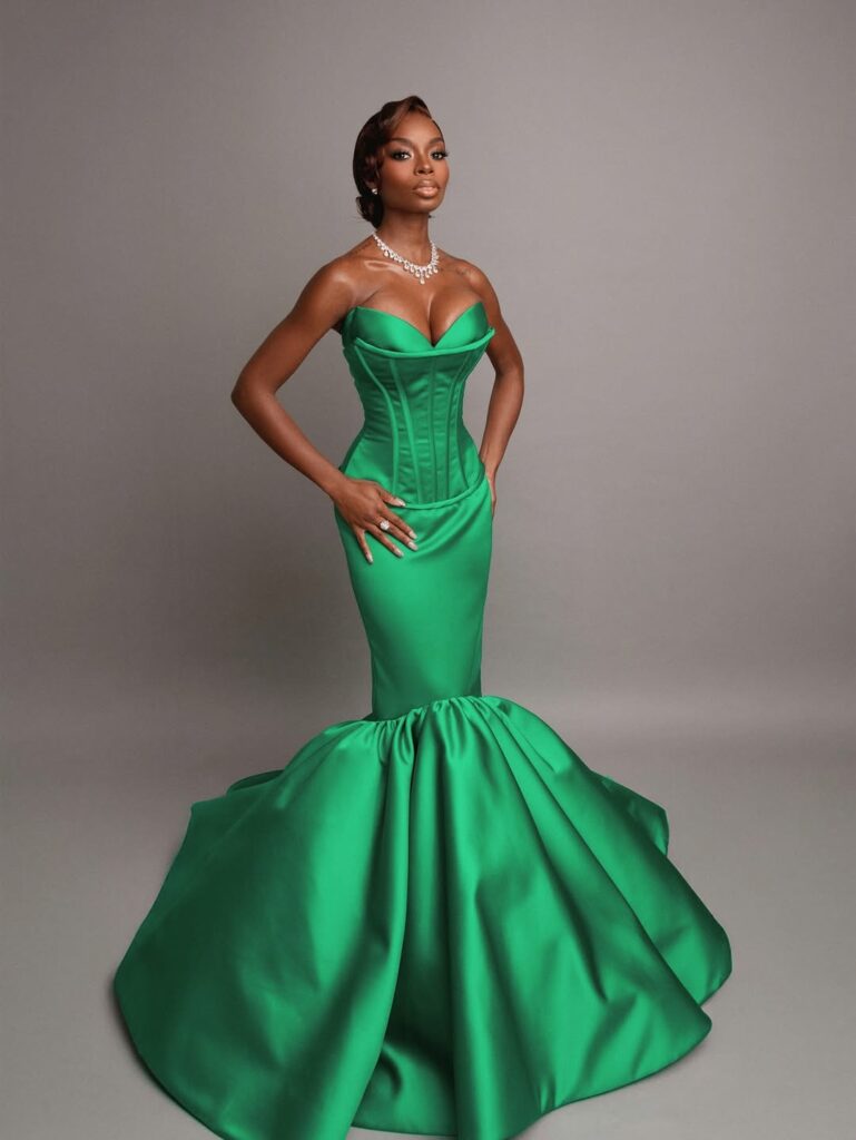 Accessories were carefully selected. Olandria wore diamond jewellery from A. Jaffe, Anabela Chan, and Anayah, adding just the right amount of sparkle. Her hair was styled in a chic twisted chignon at the nape, keeping the focus on the gown’s neckline and structure. Makeup was kept clean while adding her viral brown lip combo paired with softly flushed pink cheeks.