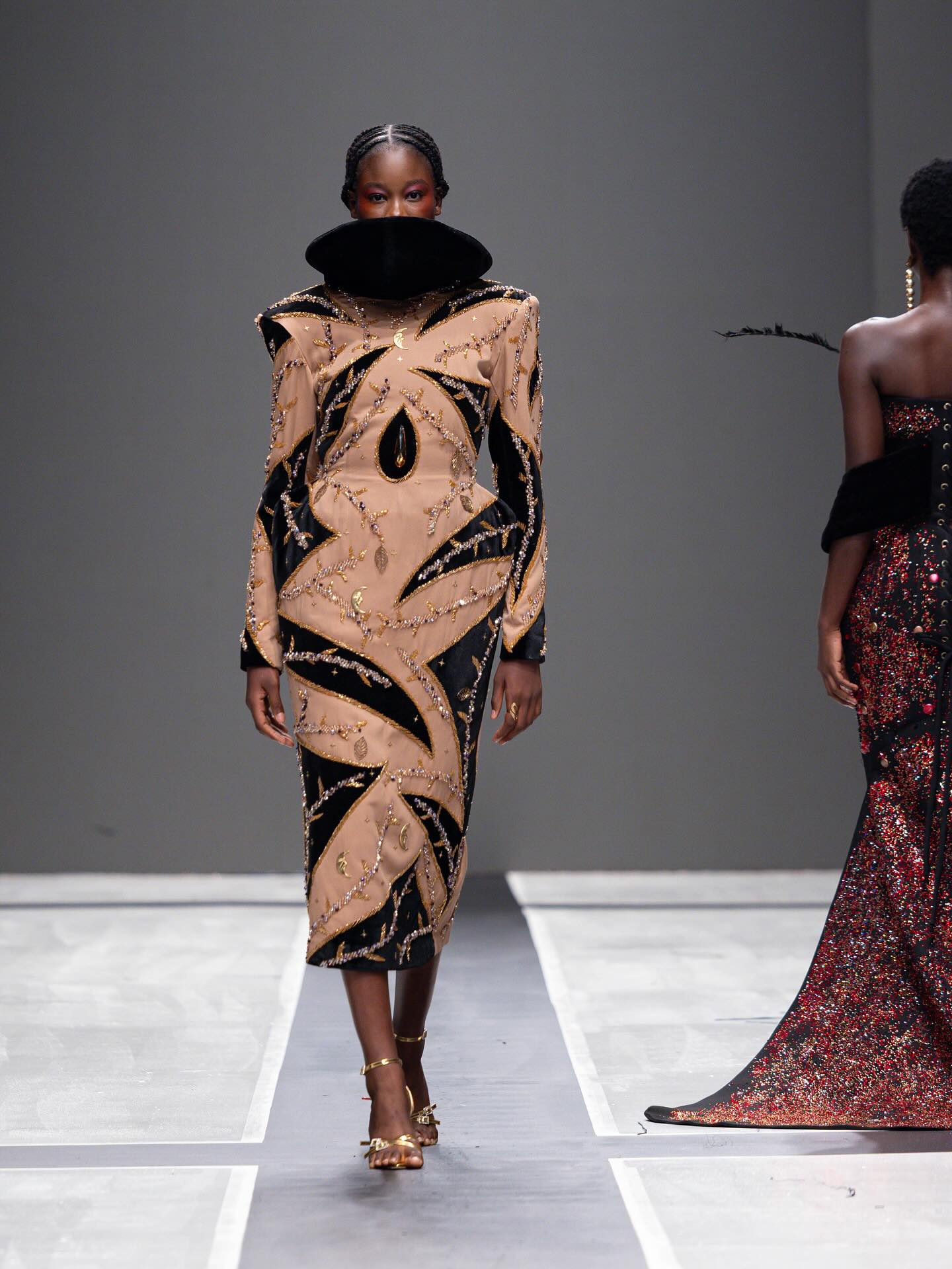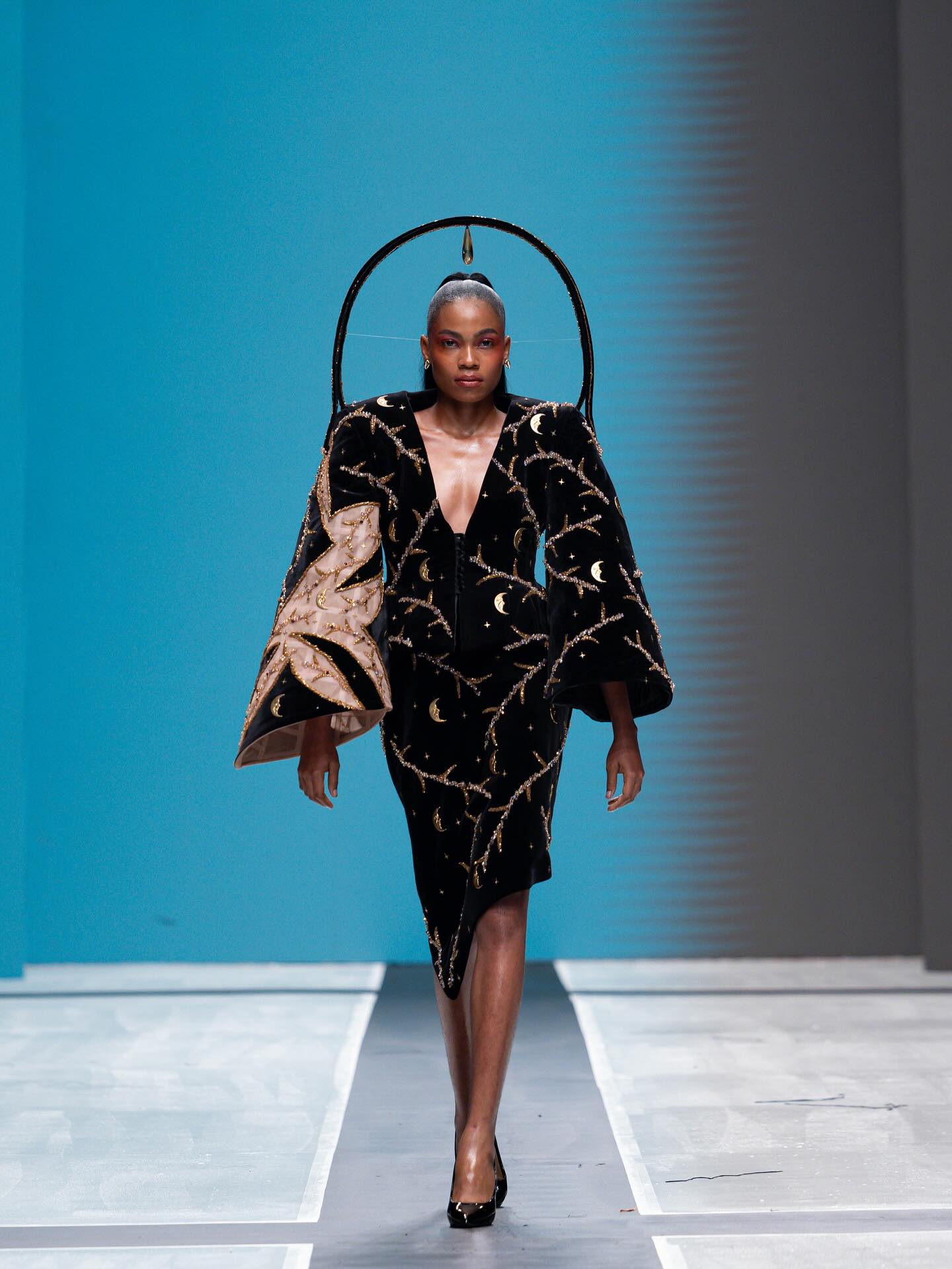 The collection presented a series of sculptural silhouettes, richly embellished looks, and architectural forms that challenged conventional design. The opening look a black dress with intricate embellishments, structured sleeves, and a celestial-inspired conical frame around the face immediately set an ethereal tone, transporting the audience beyond the ordinary.