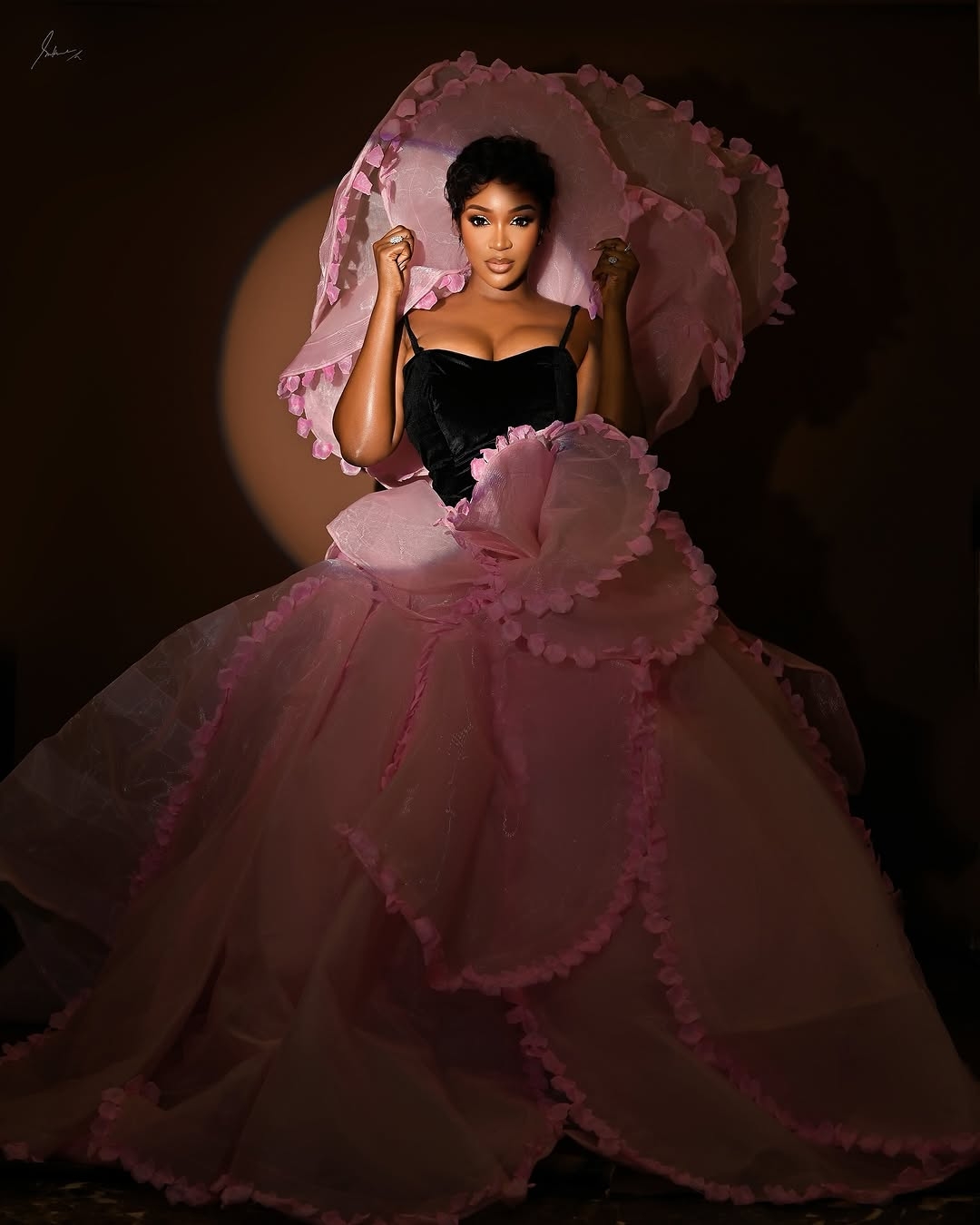 Idia Aisen stepped out looking like she walked straight out of a magazine cover, and we are absolutely loving it here. Recently, she wore an elegant ball gown from Agbons-GL Couture that was bold and at the same time had a romantic energy. The top part is a black velvet bodice with tiny straps. The dress then moves to a fabulous pink tulle skirt that goes down to the waist.