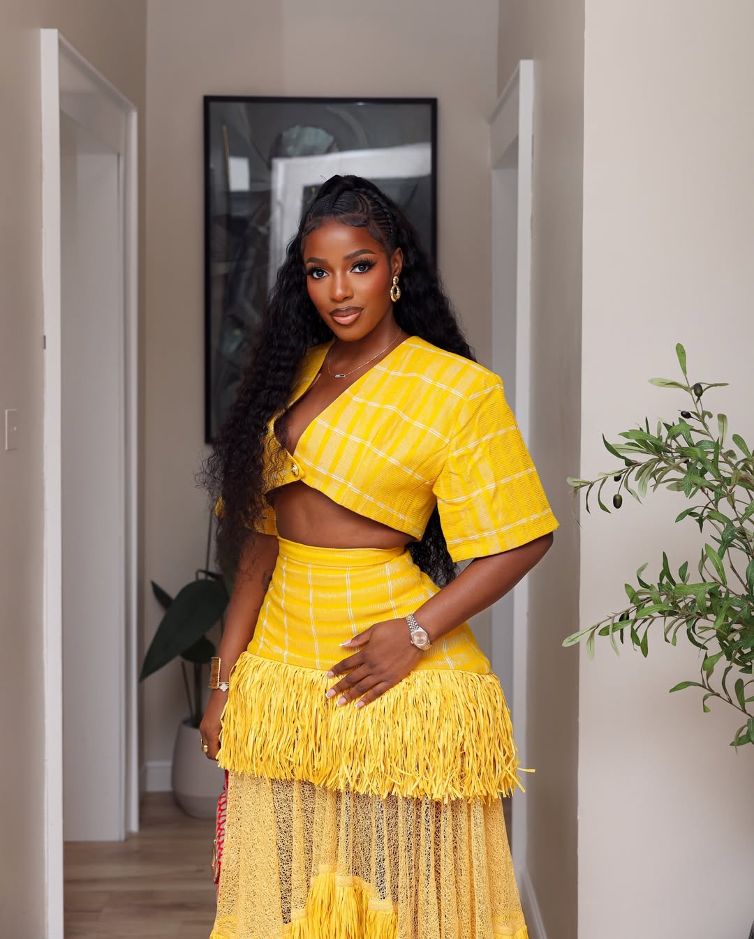 Her hair was worn in a half-up ponytail with loose, voluminous body waves; it complements the structured top and fringe. Her makeup had a soft glam look with a dewy finish, defined brows, winged eyeliner, and a warm nude lip. Her gold-toned jewelry adds warmth to the yellow.